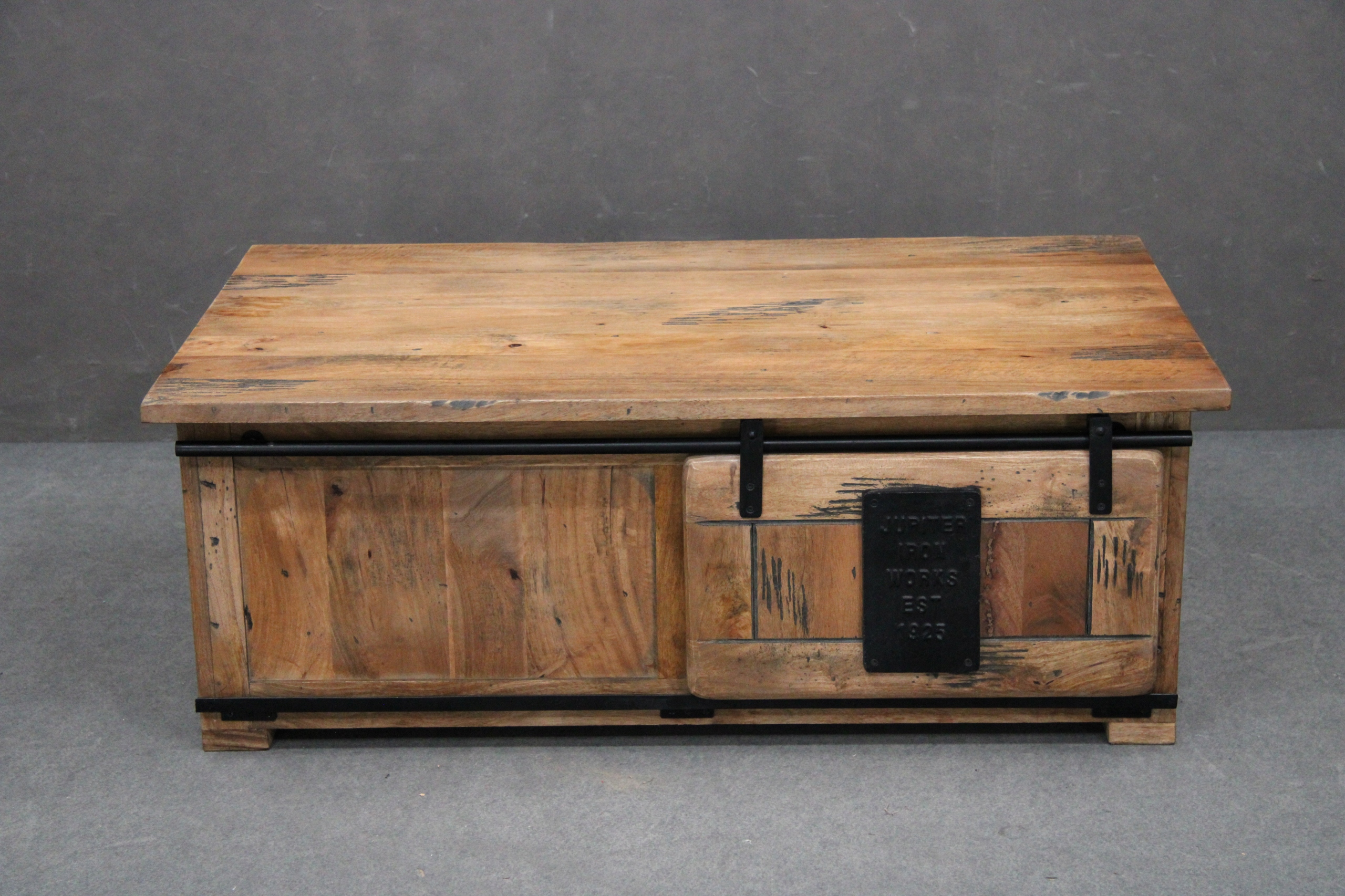 Маленька дерев’яна лавка нова. Зроблено з індійського дерева манго. Двері, зроблені в промисловому стилі на валиках з металевою обробкою на фронтах. У журнальному столику є розсувні двері з обох боків, тож ви можете мати повністю відкриту полицю або одну сторону. Таблиця може мати різні комбінації залежно від планування дверей. Кожен предмет меблів унікальний завдяки ручному виробництву та видам дерева. Він відрізняється кольорами та структурою дерева (невеликі тріщини, отвори, делікатні порожнини, які зроблені навмисно), це підкреслює індивідуальність меблів.