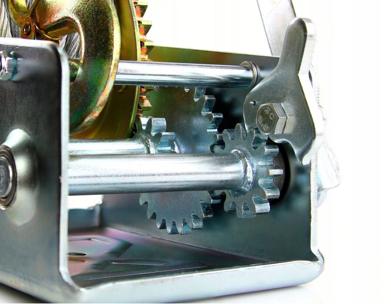 Важіль, що приводить в дію барабан, оснащений храповим механізмом. Лебідка оснащена міцним рухомим гаком із захистом і запобіжником із храповою пружиною.