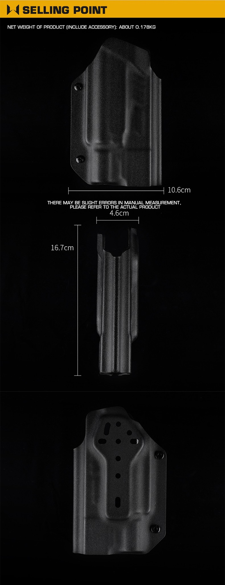 4 Забезпечує безпечну форму та оптимальну продуктивність для тактичних конфігурацій.Преміум -конструкція Kydex : виготовлений з високоякісного американського Kydex через Wosport, цей легкий кобура (0,178 кг) пропонує довговічність та будівництво швидкого малювання, що ідеально підходить для тактичного обладнання або плівок.