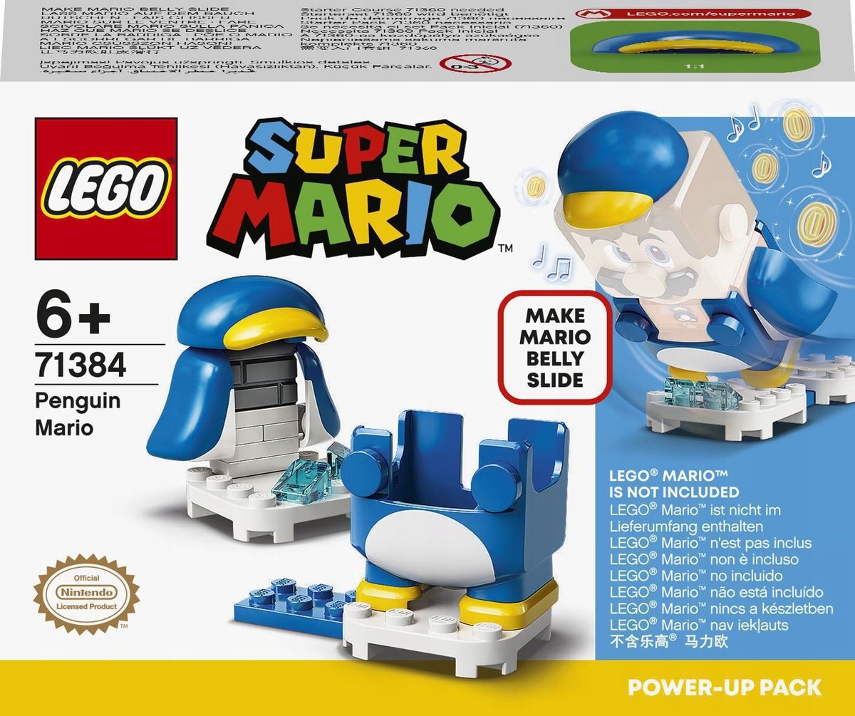 Гра з фігуркою LEGO® Super Mario™ (не входить у комплект) тепер може бути набагато веселішою, оскільки інтерактивний костюм із набору розширення Mario Penguin ( 71384) дозволяє заробляти додаткові монети, ковзаючи на животі, як це роблять пінгвіни! Це ідеальний подарунок для дітей, які люблять бути прикладом для наслідування та вже мають стартовий набір «Пригоди з Маріо» (71360) із фігуркою Маріо LEGO. Будівництво та гра Під час створення набору діти можуть використовувати брошуру, що входить до комплекту, або безкоштовний додаток LEGO Super Mario, який також дасть їм багато ідей щодо будівництва та гри та дозволить їм безпечно обмінюватися ідеями з іншими дітьми. Супер Маріо в реальному світі Колекційні набори LEGO Super Mario дозволяють грати в реальному світі з культовим ігровим героєм Nintendo®. Використовуючи Стартовий набір, набори доповнень і пакети доповнень, шанувальники можуть створювати власні складні рівні та грати поодинці чи з друзями та родиною.
