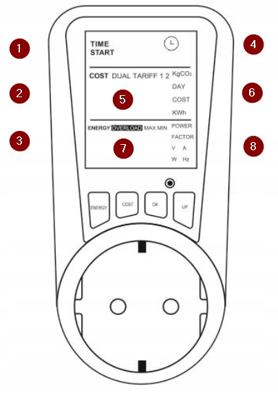 ViRONE EM-5 WATCHTOWERдозволяє перевірити споживання електроенергії та розрахувати вартість енергії, спожитої підключеним пристроєм (2 окремі тарифи). РК-дисплей з підсвічуванням полегшує налаштування та зчитування параметрів навіть у погано освітлених або темних місцях.