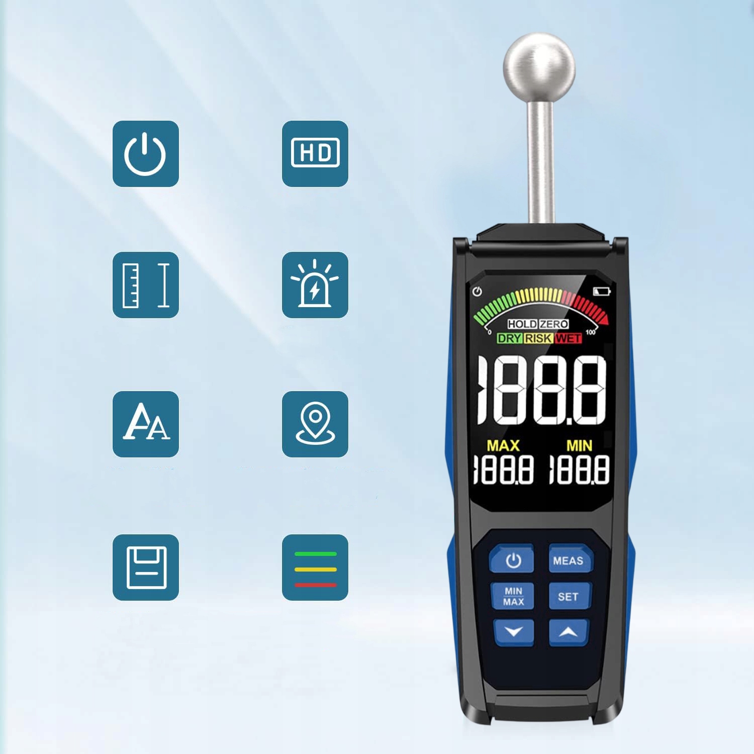 ➡ випромінюються хвилі високої частоти можуть проникати на глибину близько 40 мм і не пошкодити поверхню об'єкта. Легко виміряти рівень вологи навколо кутів, нерівномірних поверхонь та плінтусних дощок.