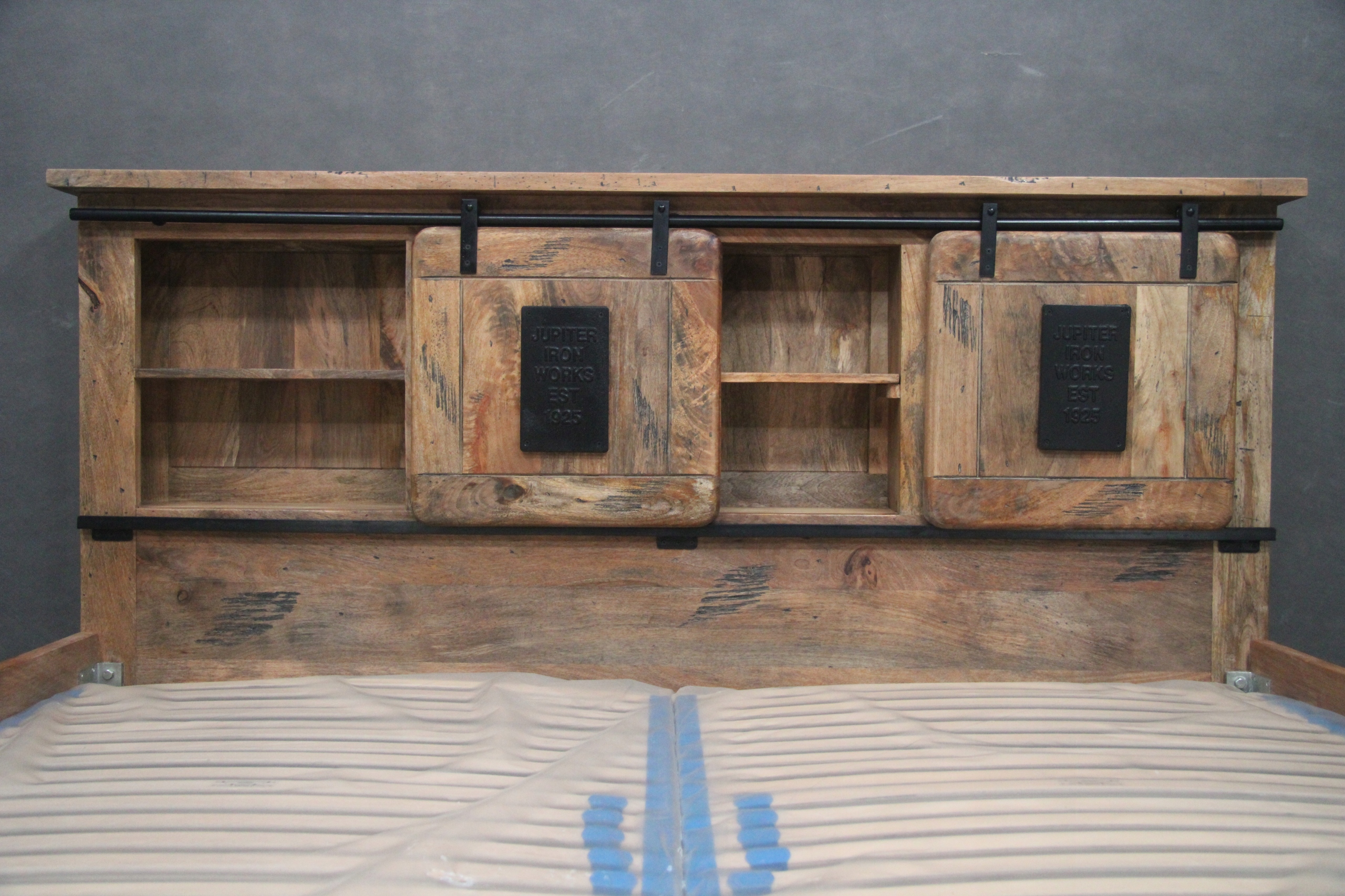 Кадр нова в стилі горища / старовинного. Зроблено з індійського дерева манго. Кожен предмет меблів унікальний завдяки ручному виробництву та видам дерева. Він відрізняється кольорами та структурою дерева (невеликі тріщини, дірки, делікатні порожнини, які зроблені навмисно), це підкреслює індивідуальність меблів. Двері, зроблені в промисловому стилі на валиках з металевою обробкою на фронтах.