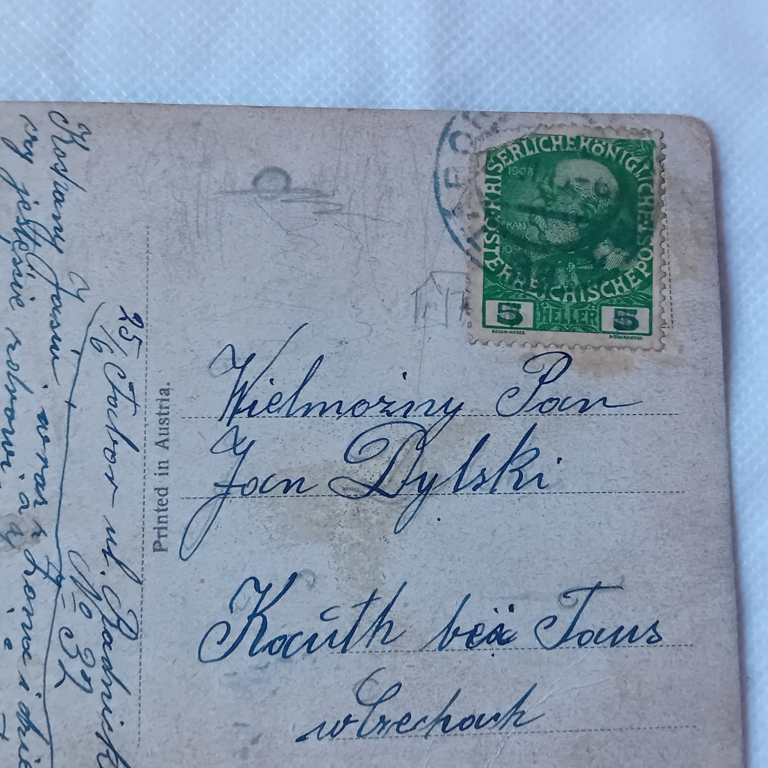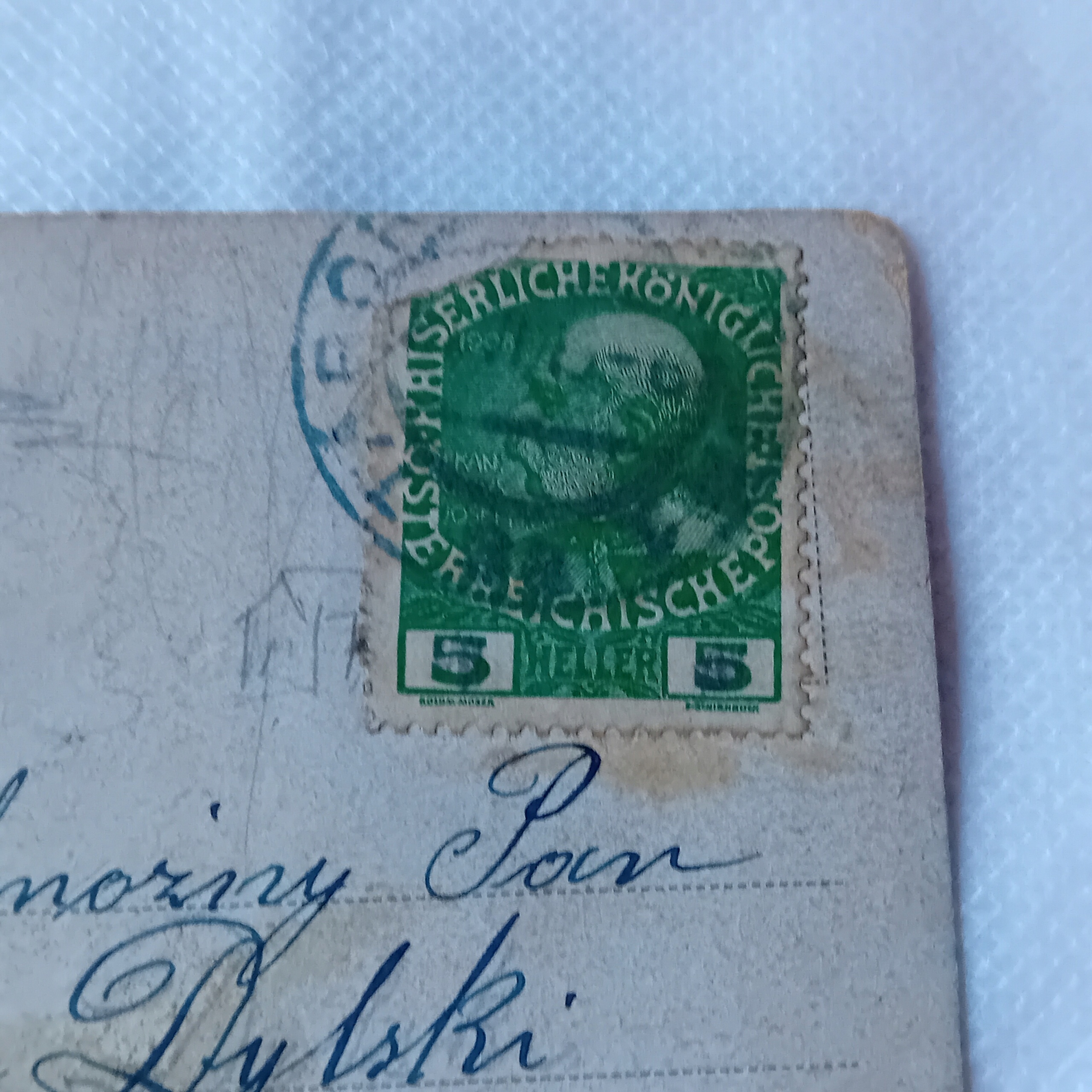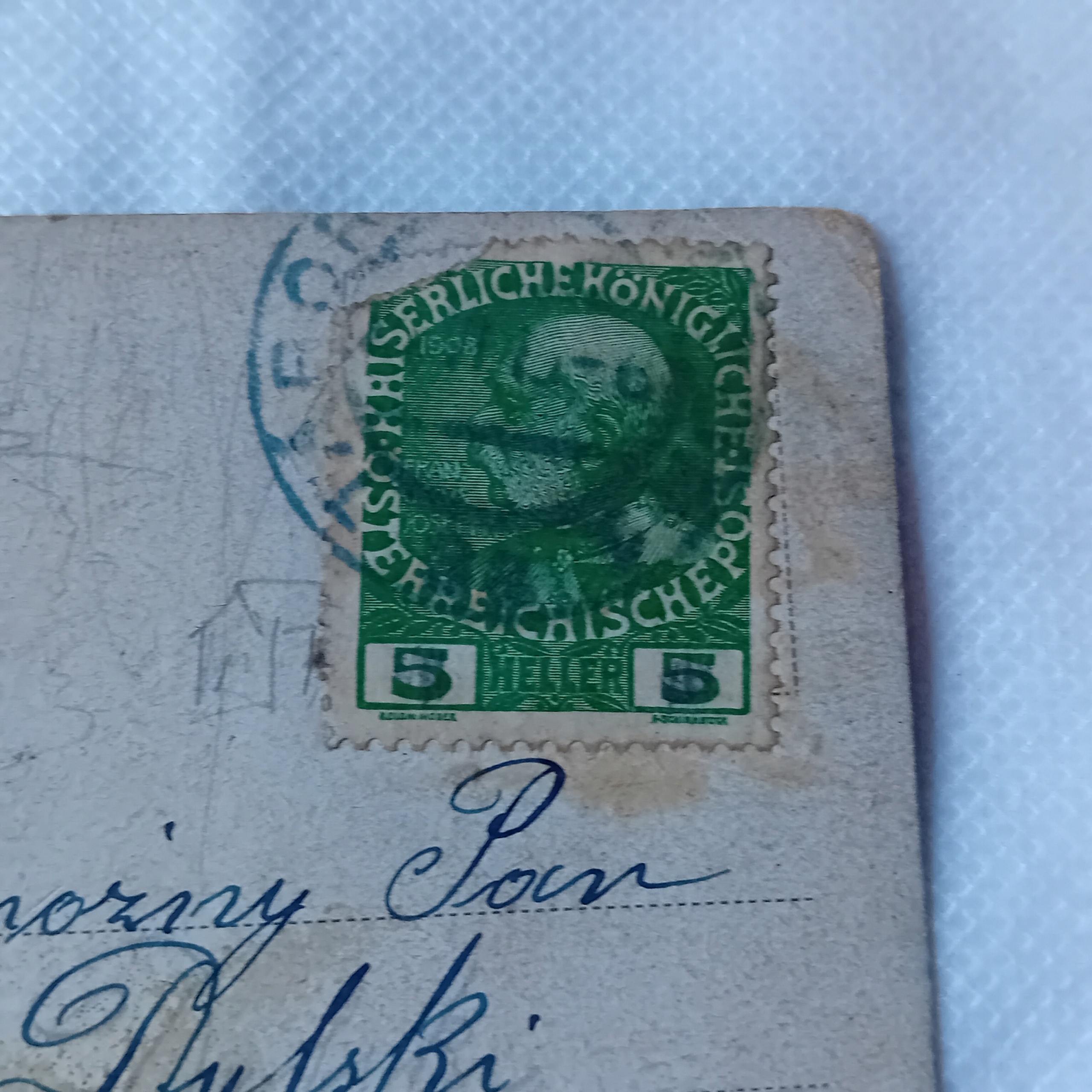 Продам австрійську листівку, виробник: Monopol - Австрія. Тиражна листівка, з маркою, нажаль дата розміщення на марці нерозбірлива. Листування польською мовою, місце походження та адреса одержувача в Чехії. Марка із зображенням імператора Франца Йосифа, номінал 5 гелерів, рік випуску 1908. Автор марки: видатний чеський художник: графік, скульптор і дизайнер, працюючий у знаменитих Віденських майстернях – Коломан Мозер. Стан листівки досить добрий, кути погнуті та потерті. Листівка брудна звороту.