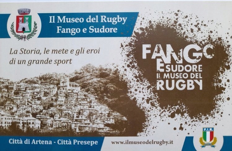 Опис: Це офіційна листівка, видана Музеєм регбі, розташованим в Артені в Італії. На ньому зображено фото міста, де розташований музей, і його головне гасло - "грязь і піт. Музей регбі". Також є ознака італійської федерації регбі.