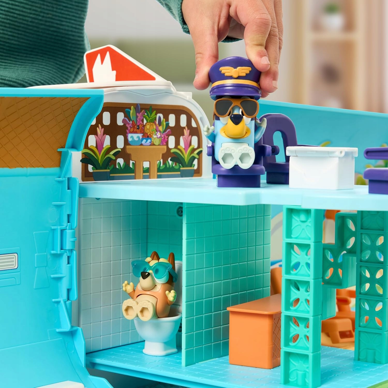 Готуйтеся до свят із ігровим набором Bluey «Літак-трансформер» 3 в 1! Цей багатофункціональний ігровий набір літака перетворюється на курорт і човен із фігуркою Блюі в капелюсі пілота й сонцезахисних окулярах, фігуркою Бінго, світлом і звуками та 15 святковими ігровими елементами! складаний літак відкриває ігровий набір шириною 70 см із 2 рівнямиі великою кількістю простору для дослідження, включаючи лобі готелю, спальню та пляж! Кабіна перетворюється на човен, додаючи пригод, з понад 25 звуками та фразами з шоу, австралійським паспортом і аркушем наклейок для додаткової розваги.