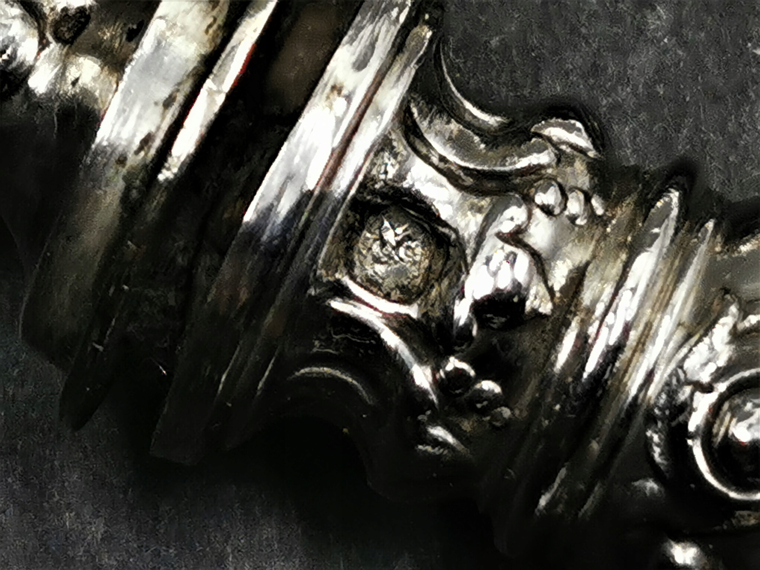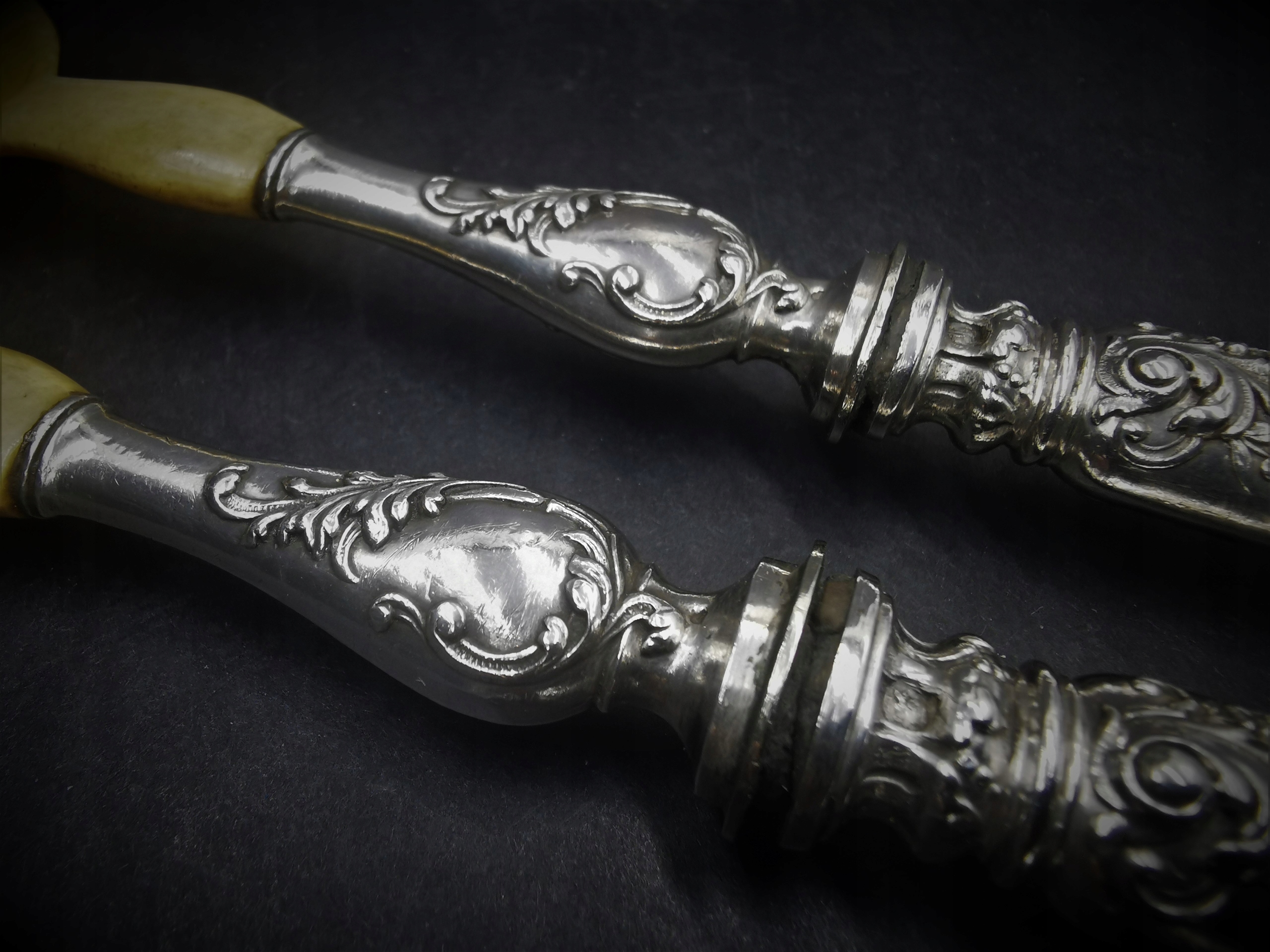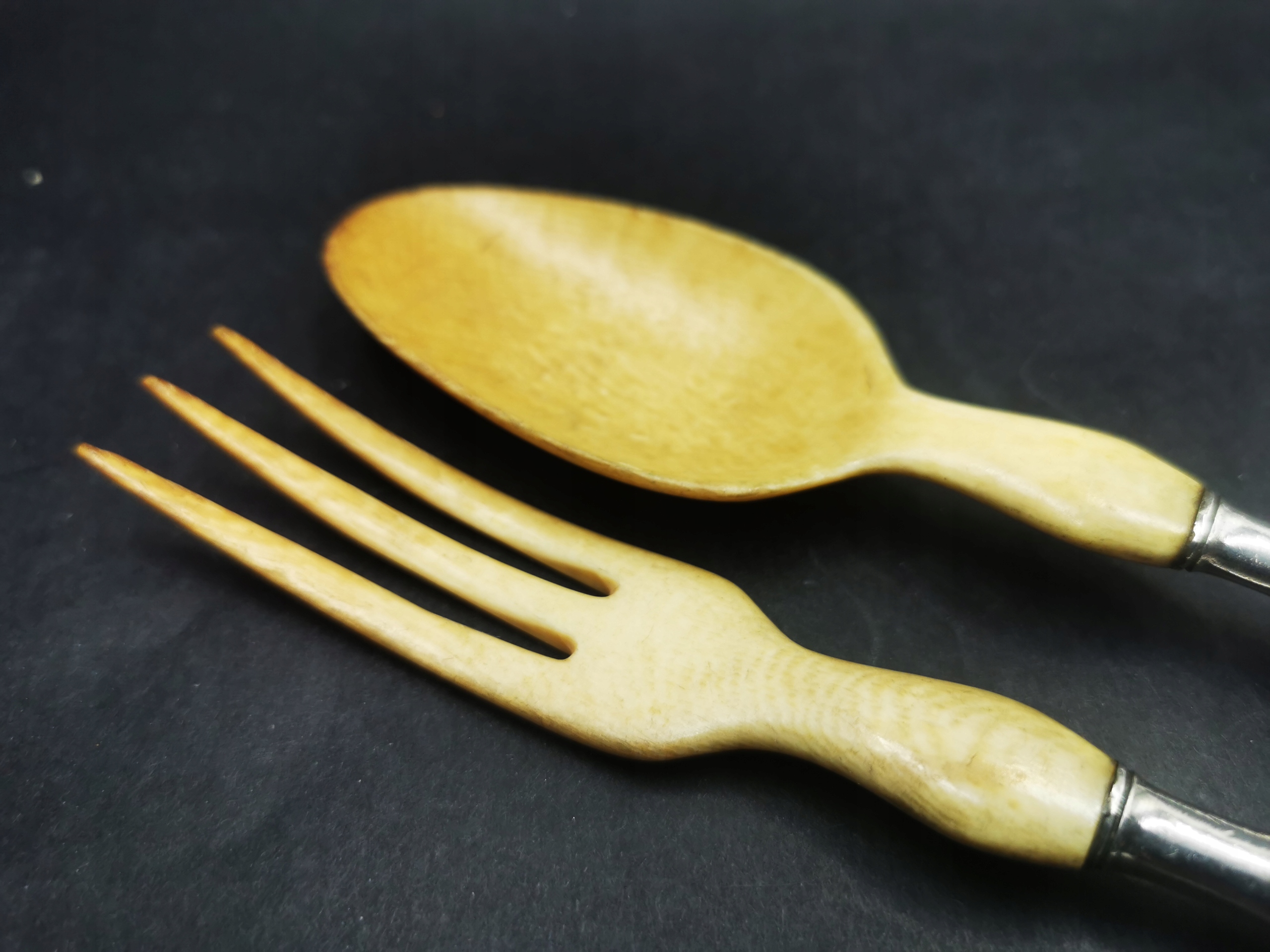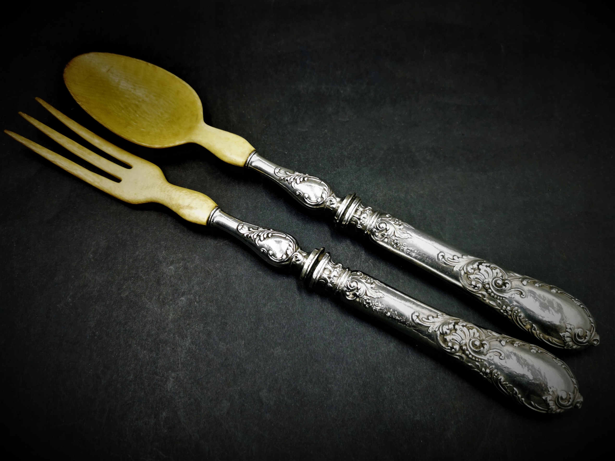 Унікальний антикварний набір для подачі листя салату, з Франції. Набір складається з довгої виделки та ложки, прикрашених декоративною ручкою. Їх унікальний зовнішній вигляд в основному пояснюється поєднанням кісток, з яких складаються ложка та виделка, зі срібною частиною, яка становить їх ручку. Вони були створені приблизно в 1930-х роках.