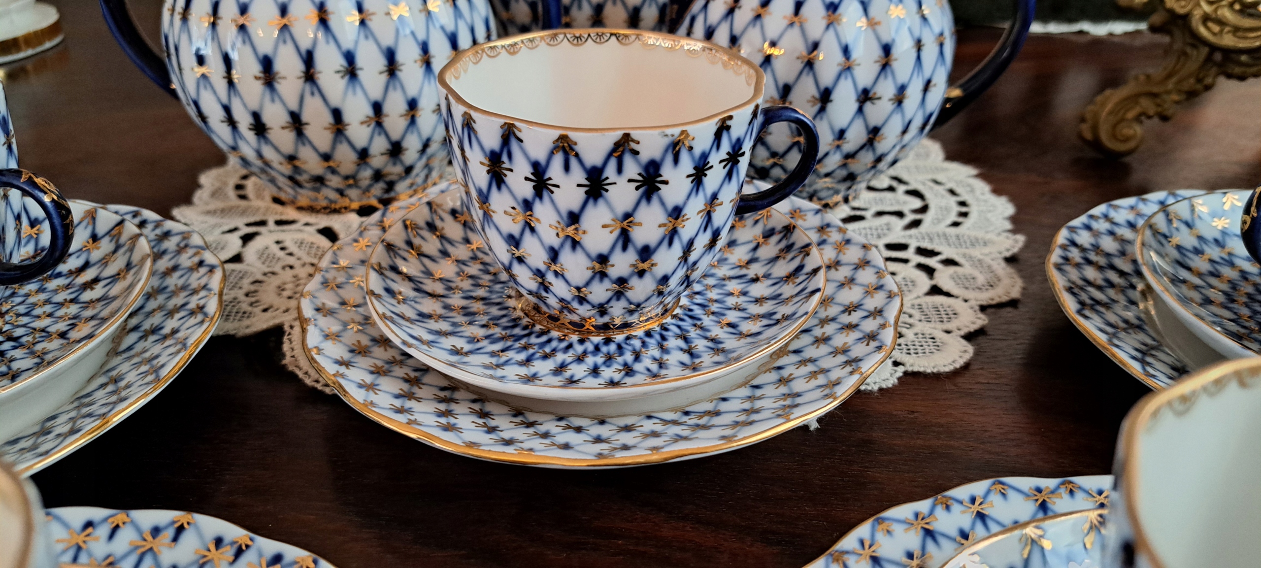 Надзвичайно ексклюзивний сервіз, декорований вручну 22-каратним золотом і кобальтом, є одним з найбільш впізнаваних і затребуваних візерунків - кобальтова сітка