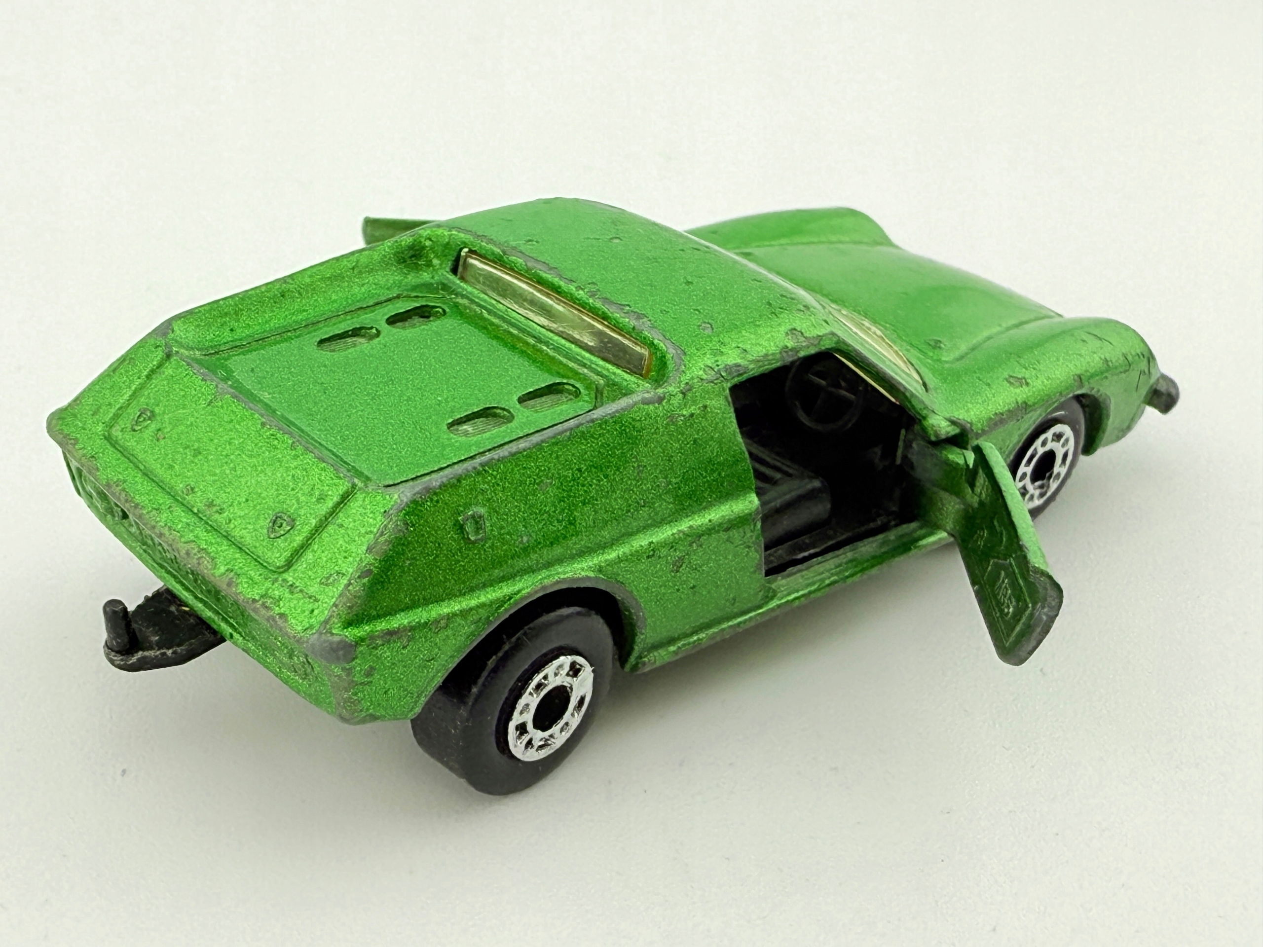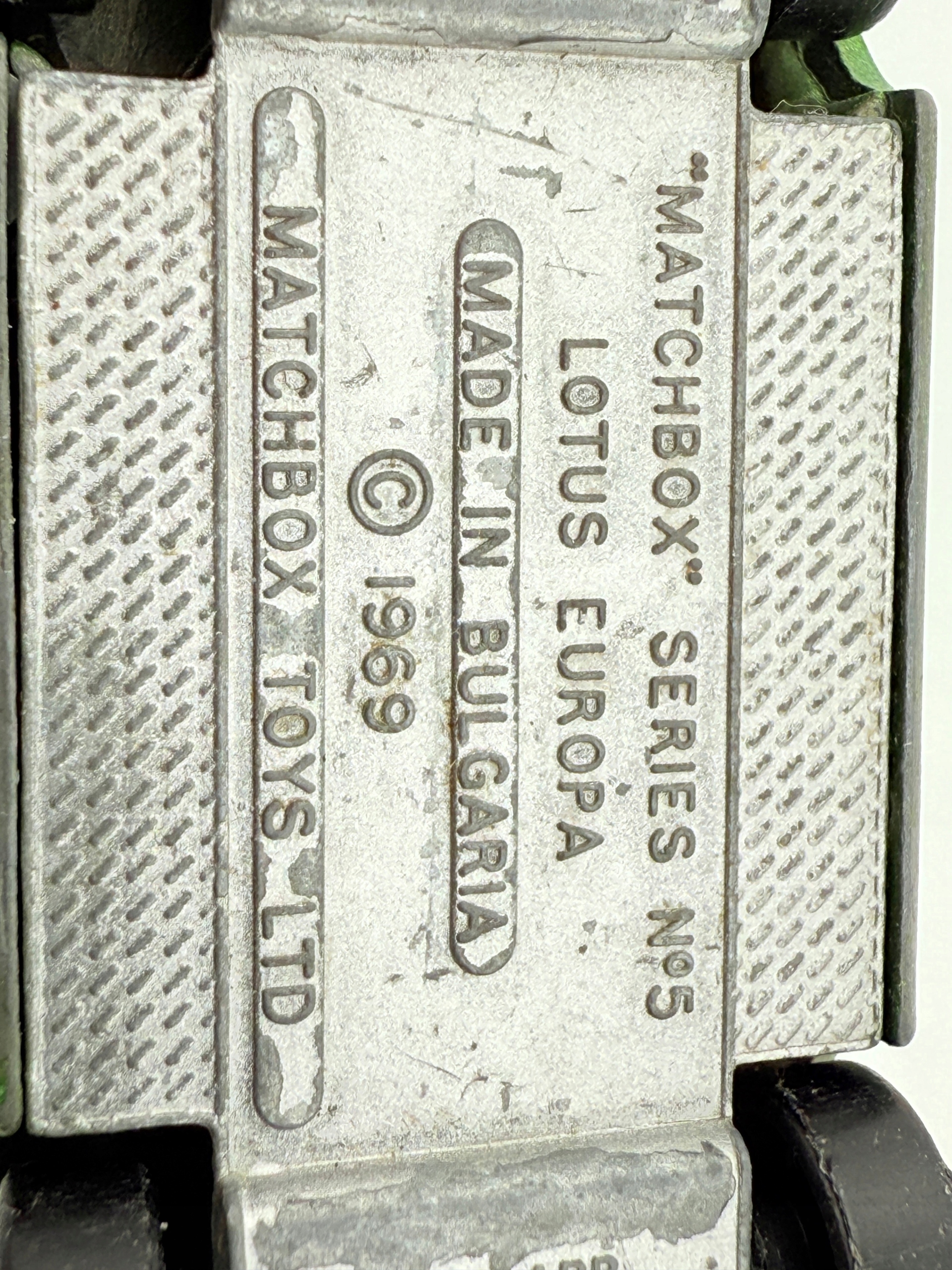 позначка: сірник • Модель: Lotus Europa • Виробник: Matchbox Toys Ltd • Масштаб: 1:64 • Умова: Використовується • Матеріал: метал + пластик • Довжина (мм): 70 мм • Кольори: зелений з металевим покриттям • Додати -они: відкриття дверей, деталі інтер’єру • Номер каталогу: #33 • Зроблено в: Болгарії