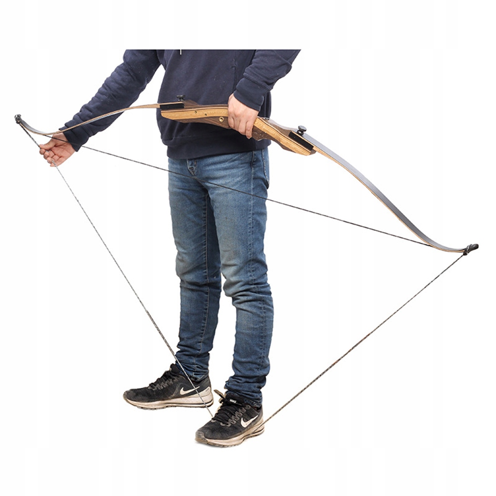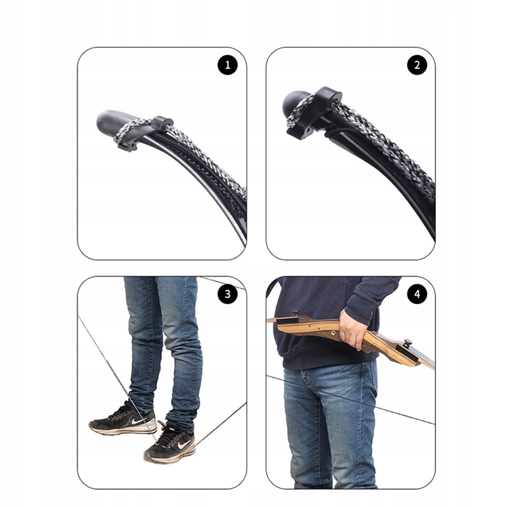 По -перше, один кінець підборіддя вільно знаходиться у верхній частині однієї дугової руки з меншим оком, а потім більшим гумовим кінцем натягувача лука. На іншому плечі ми нанизуємо більший акорд, а потім надягаємо на гумовий кінець натягувача. Середина арки тримає однією рукою, центр кабелю нахилений і приваблює, щоб арка зігнулася так само, як при розтягуванні. Це скорочує арку нижче її звичайної довжини, і акорд тепер може бути легко надягнути на інше плече. Використовуючи натягувач, нам потрібно використовувати набагато менше сили, ніж при введенні акорду, коли арка зайво закручена і завантажується. 4Параметри:
