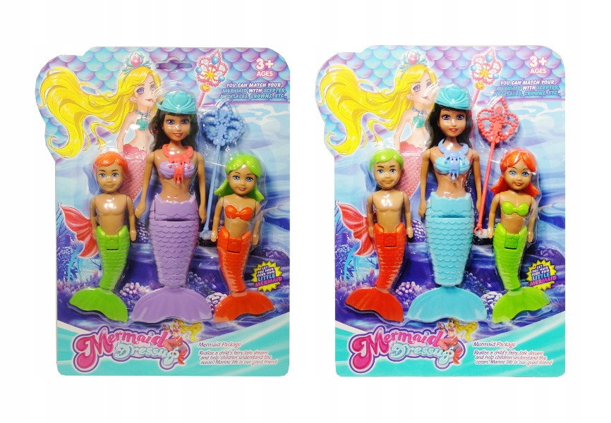 Перенесіться до океану з набором із 3 русалок для гри. Найбільший з них заводний і рухається у воді. Додатково можна прикріпити наявні в наборі корону, намисто або скіпетр. Товар для дітей від 3 років. Іграшка упакована в картонну основу з прозорим плафоном. Наведені розміри відповідають розмірам іграшки в упаковці.