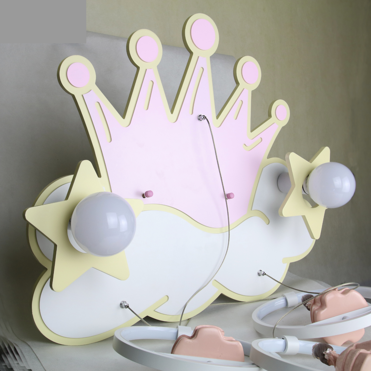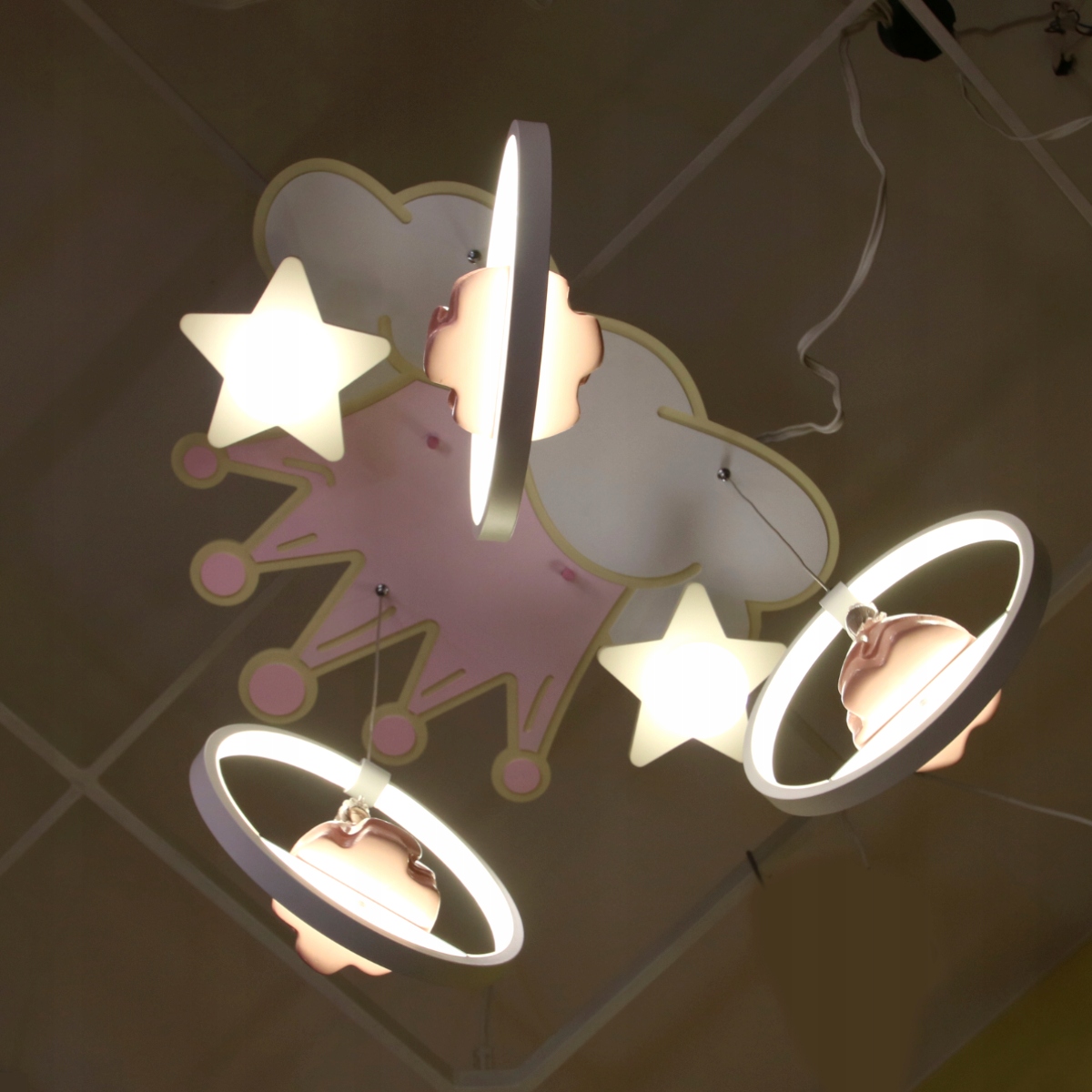 Ця люстра є чудовим елементом декору кімнати кожної маленької принцеси. Його неповторний шарм полягає в пастельних тонах, різноманітному освітленні та гідному товаристві трьох чарівних фігур. Люстра виділяється з-поміж інших, вона виконана з увагою до деталей. А коли світлодіодні диски засвітяться, це буде справді чарівно!