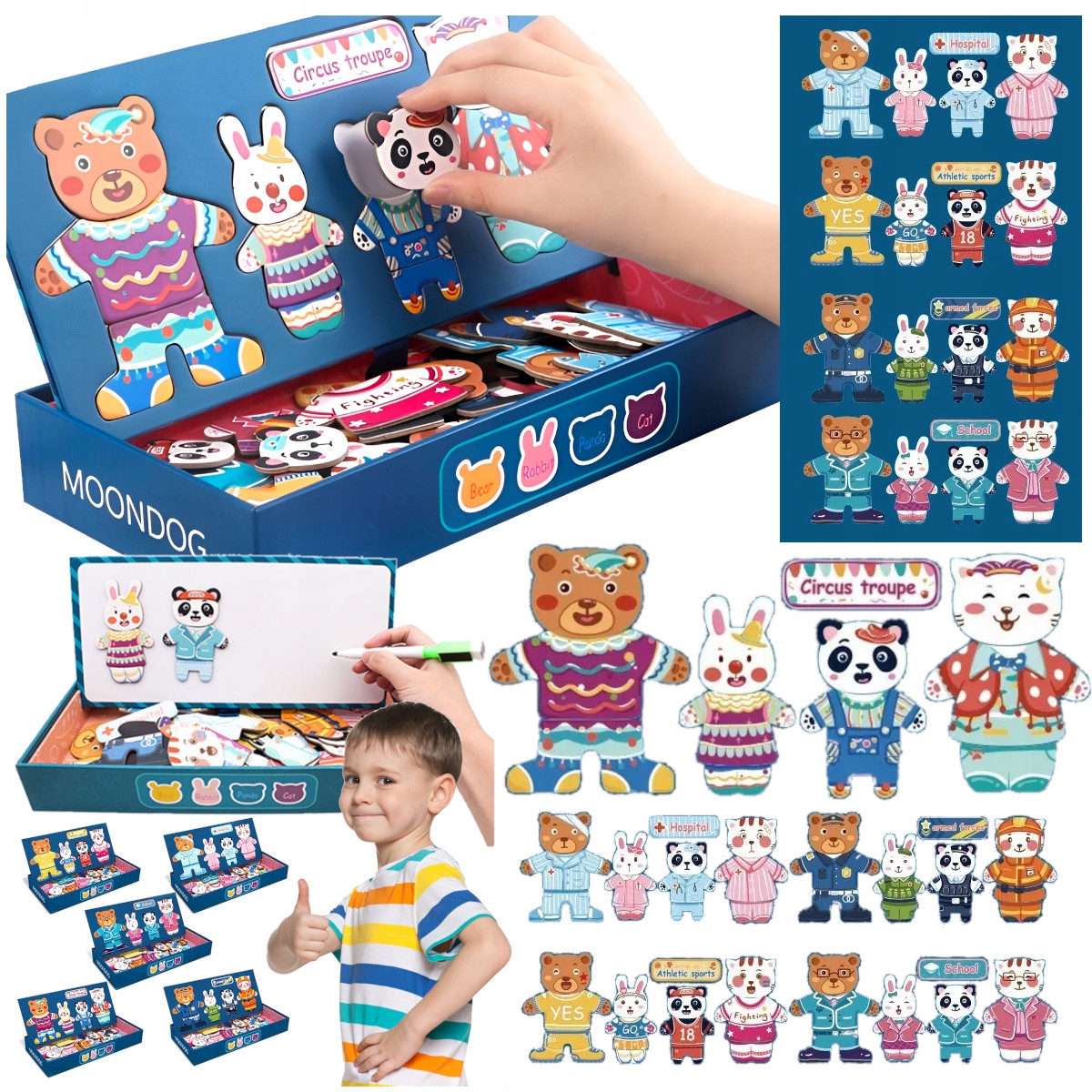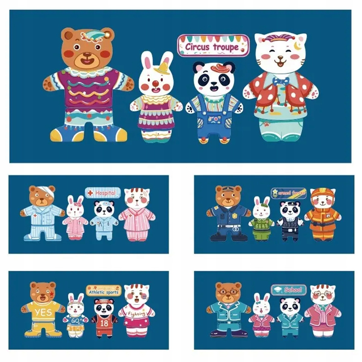 Набір складається з магнітних пазлів для одягу. Завдяки цьому малюк може вільно змінювати та поєднувати елементи, змінюючи розташування одягу ведмедиків. Це даєнескінченну кількість комбінацій. В набір входить 5 готових тематичних костюмів для всіх ведмедиків: