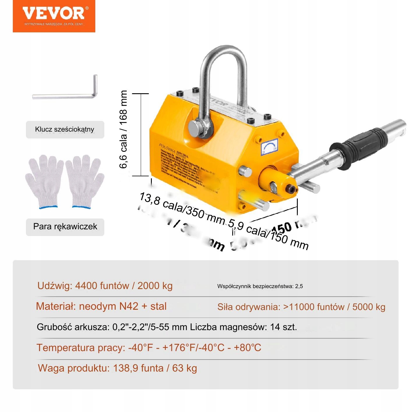 Магнітний підйом з постійною силою дозволяє підняти навантаження до 2000 кг. Використовує N42 неодимові магніти, що дозволяє ефективно підвищувати сталеві матеріали без необхідності електроенергії.