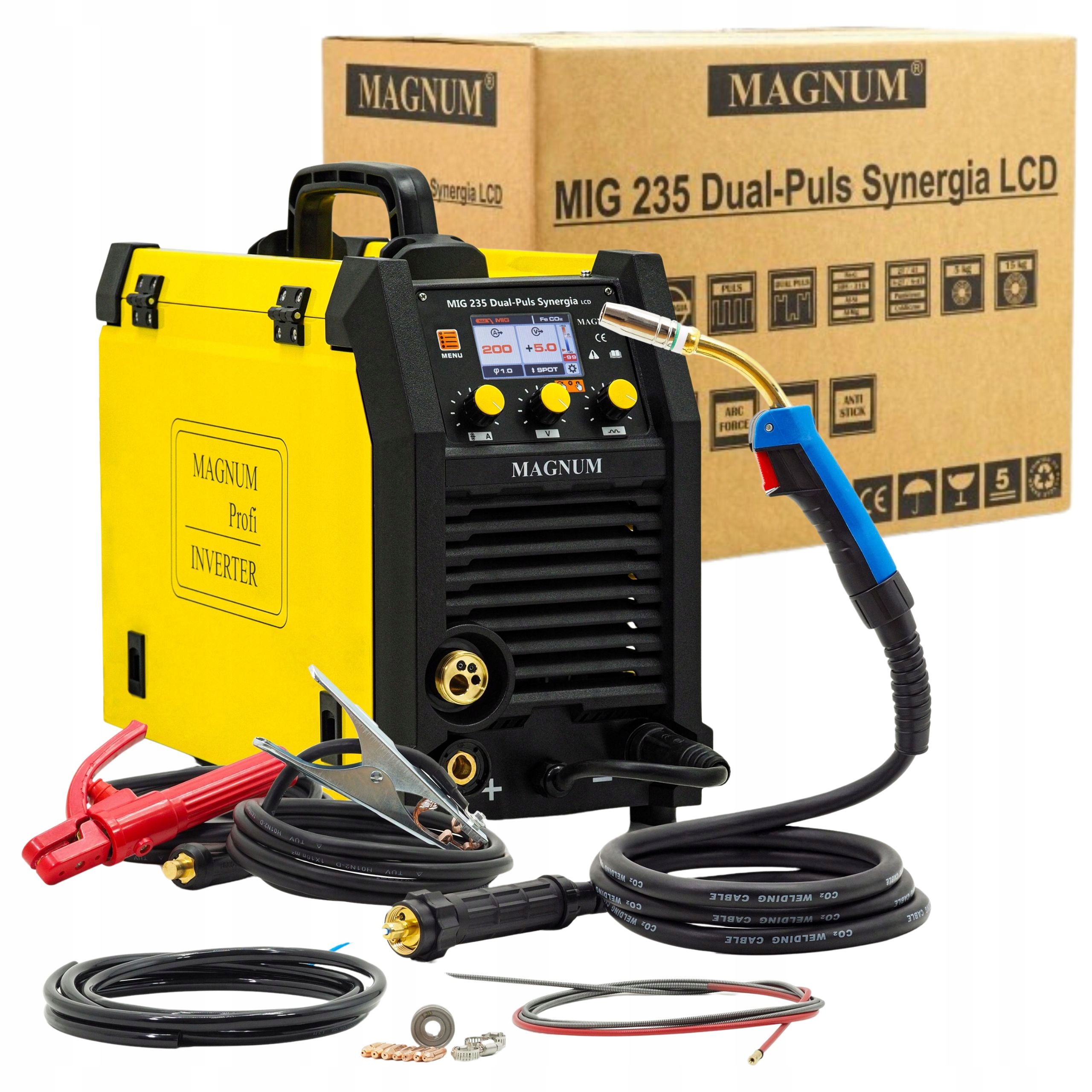 MAGNUM MIG 235 DUAL-PULS SYNERGIA — це ефективний інверторний зварювальний апарат із різноманітними можливостями, живленням від мережі 230 В, що забезпечує високий зварювальний струм і широке використання в різних зварювальних середовищах.