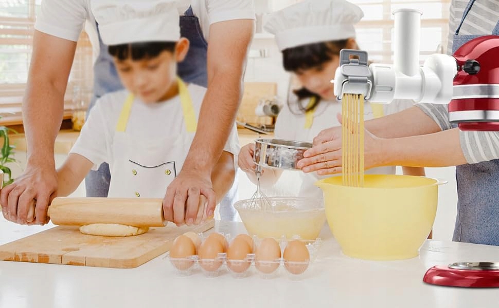 - Шість стартерів для макаронних виробів: Ця 6 -1 -1 закуска з макаронами, призначена для всіх стаціонарних змішувачів KitcherAid, оснащена шістьма формами макаронних виробів, які дозволяють готувати макарони різної форми, включаючи спагетті, букатіні, ригатоні, фузілу, невеликі та великі макарони. Форми оснащені затискачем з інтегрованою ріжучою лезом, яка здійснюється над торговою точкою макаронних виробів і дозволяє отримати будь -яку довжину макаронних виробів.