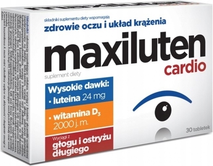 Maxiluten cardio містить високу дозу лютеїну, а також зеаксантину та вітамінів і мінералів (бета-каротин як джерело вітаміну А та цинку), які можуть сприятливо впливати на зір. Maxiluten призначений для людей, які хочуть підтримувати здоров'я очей, а також для людей, які піддаються впливу факторів, які можуть призвести до погіршення зору. Крім того, завдяки екстракту глоду та куркуми підтримує правильну роботу серця та кровоносної системи.