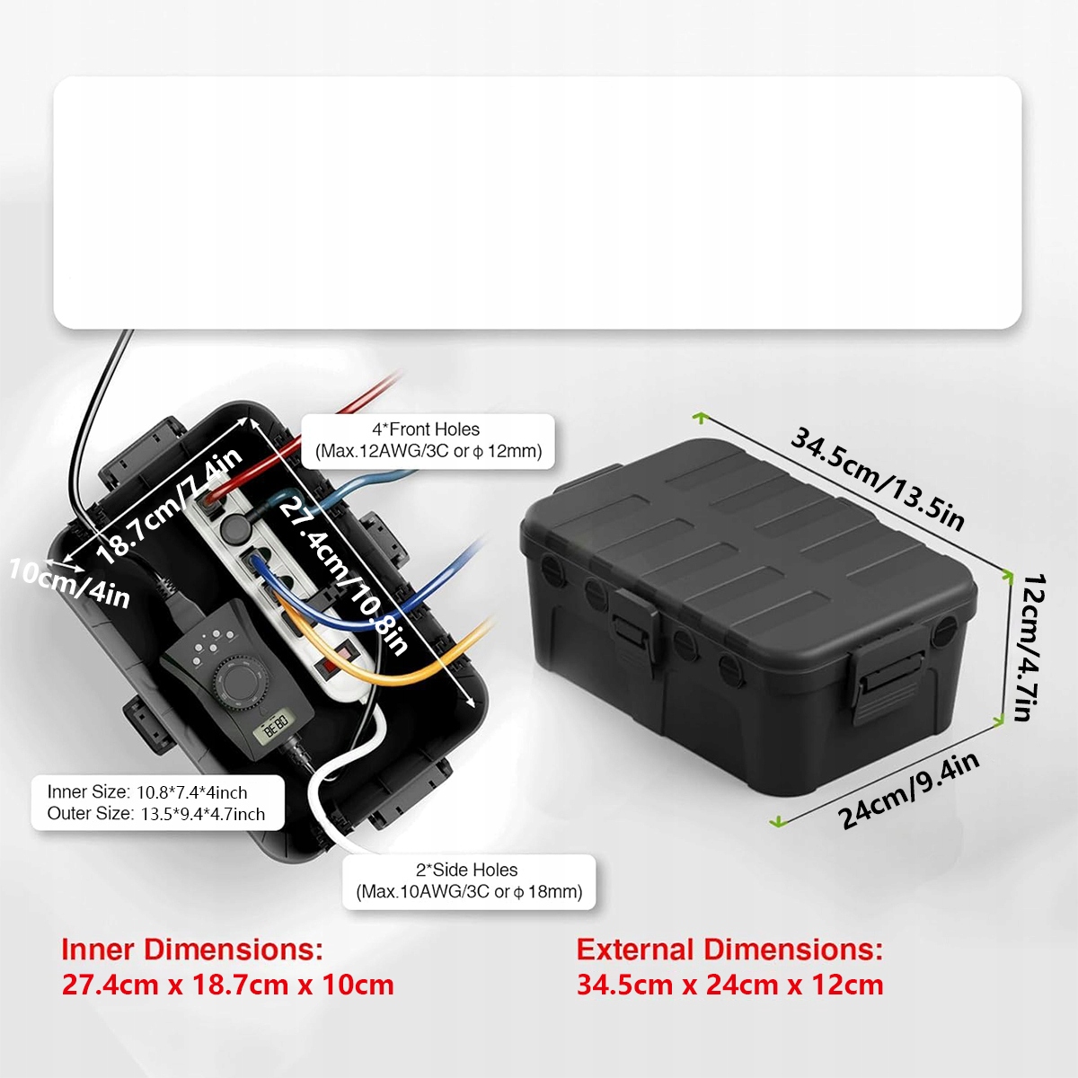 Створено для безпечного тимчасового зовнішнього кабельного з’єднання. Завдяки великим розмірам (34,5*24*12 см) і 6 кабельним вводам (спереду*4 + збоку*2) це комплексне рішення для захисту зовнішніх подовжувачів, розеток таймерів, подовжувачів, великих адаптерів і більшості інших електричних з’єднань.