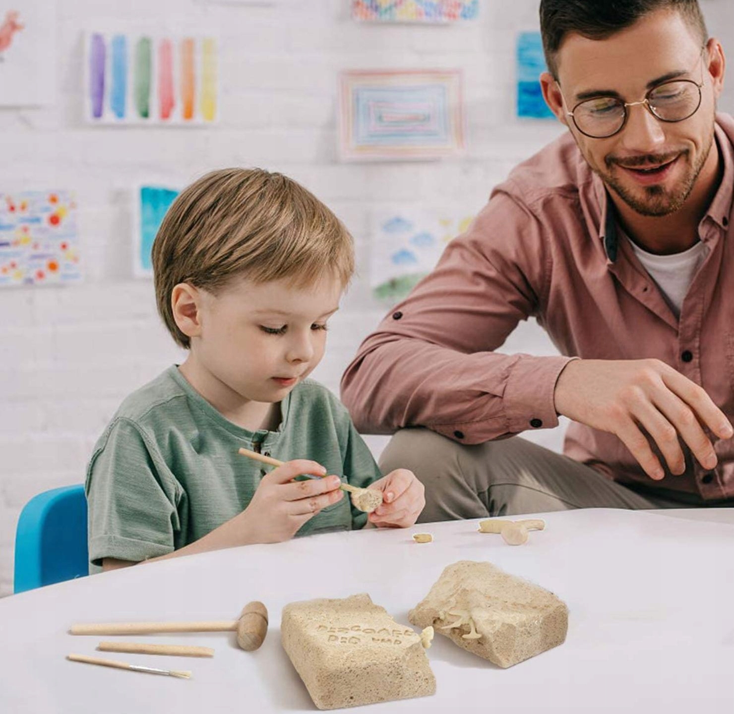 Набір для юного вченого. У блоці захований скелет динозавра, який потрібно викопати за допомогою інструментів, що входять до набору, а потім з’єднати кістки, щоб отримати скелет мамонта.