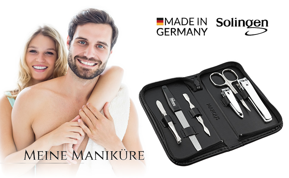 - SOLINGEN PREMIUM QUALITY*: усі інструменти в наборі для нігтів виготовлені з яскравої нікельованої та полірованої сталі. Завдяки цьому вони надзвичайно міцні та будуть доглядати за вашими нігтями протягом багатьох років (*окрім кусачок для нігтів).