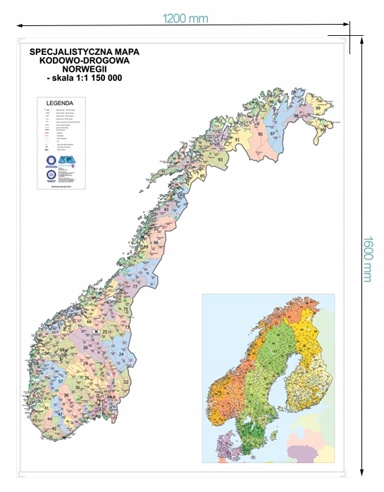 Mapa Ścienna Drogowa NORWEGII + kody 160cmx120cm Aktualna 2025