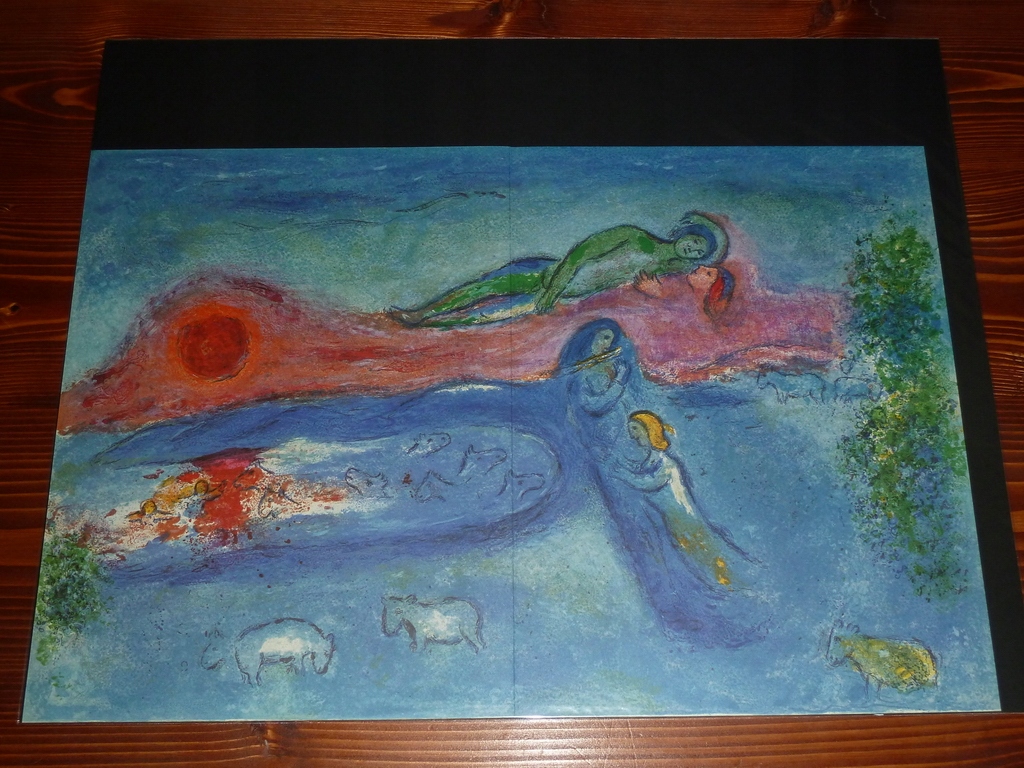 «У 1952 році [грецький видавець, спадкоємець А. Воллара] Теріаде доручив Шагалу проілюструвати старовинний роман «Дафніс і Хлоя». Ймовірно, це був єдиний твір грецького ритора, граматика та вченого Лонгоса, який написав його у 2 столітті нашої ери. Цією повістю, сповненою ліричного чару та чуттєвої чесності, захоплювалися Шекспір і Гете. Вона справила тривалий вплив на європейську літературу. Перший повний рукопис «Дафніс і Хлоя» був знайдений лише в 1810 році у Флоренції. Шагал черпав натхнення для ілюстрацій цієї пасторалі, дія якої відбувається на острові Лесбос, що в Греції. У своїх літографіях він зображував середземноморське царство Пана і Ероса, вплітаючи в них мотиви фольклору російських євреїв. Закохані зображені тут у характерному вишуканому стилі Шагала та в барвистій обстановці, яка нагадує Едем. [Марк Шагал, 2002, DPM; Польське видання: Oxford Educational]
