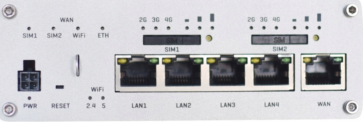 - Порти вводу/виводу: b> 5 x 10/100/1000 Мбіт/с, 1 x USB 2.0, 2 x слот для SIM-карти