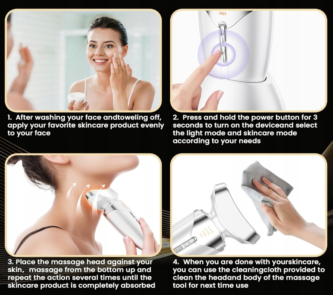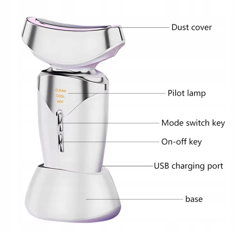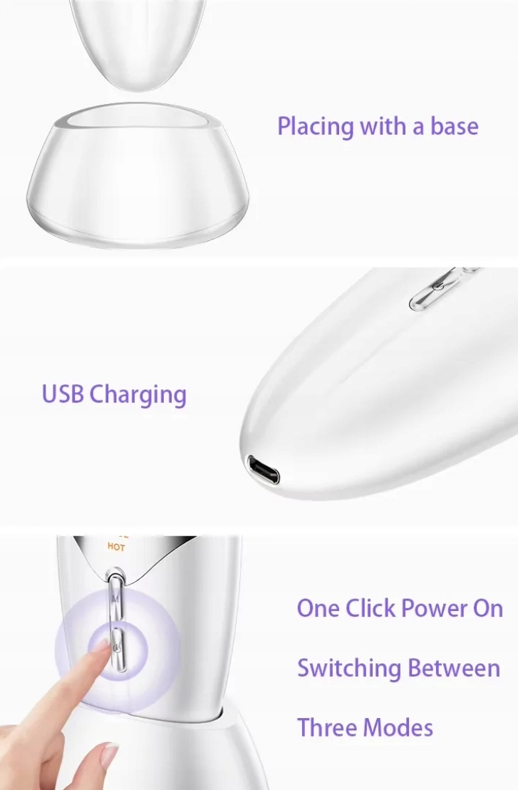 барвисте омолоджуюче світло + звукова вібрація + глибоке очищення + харчування. Позитивні та негативні іони + 45 ℃ Постійна температура гарячого компресу, завдяки якому ваша шкіра гладка і тверда.