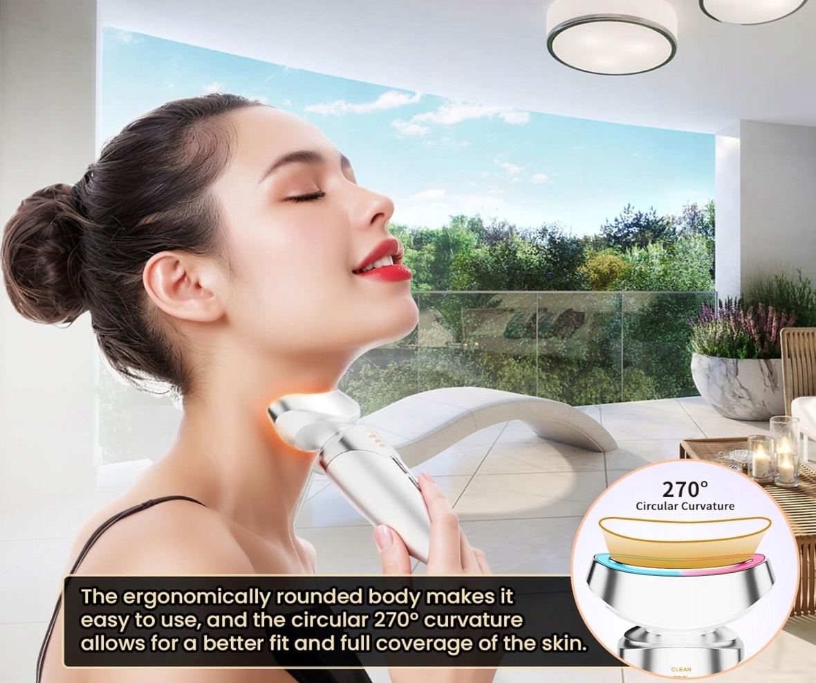 високі частоти вібрації з 43 теплотерапії ℃ допомагають відкрити пори. Трикольорна світлотерапія (синій, червоний, фіолетовий) сприяє кровообігу та стимулює точки голковколювання на обличчі та шиї.