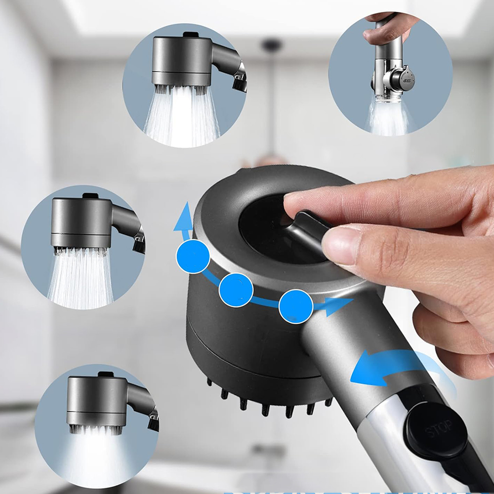 - Цей ручний душ пропонує режим розбризкування (заспокійливий і ніжний), режим тропічного душу (м’яка вода), режим змішування (сильний імпульс)< Режим /b>і полоскання (зніміть насадку).