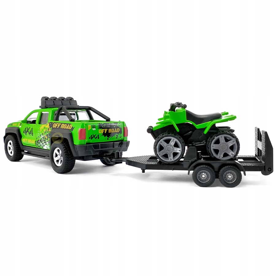 Це незвичайний позашляховик 4х4 з причепом для автомобілів для маленьких ралійників! Машина оснащена відкриваються дверцятами, які додають грі реалістичності. Також у трейлері є квадроцикл, який може стати універсальним супутником під час віртуальних експедицій.