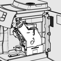 - Вставте блок заварювання назад у машину, доки він не зафіксується на місці. Не натискайте кнопку «PUSH». Посуньте контейнер для залишків кави та закрийте кришку обслуговування. Потім посуньте контейнер для кавової гущі в машину.