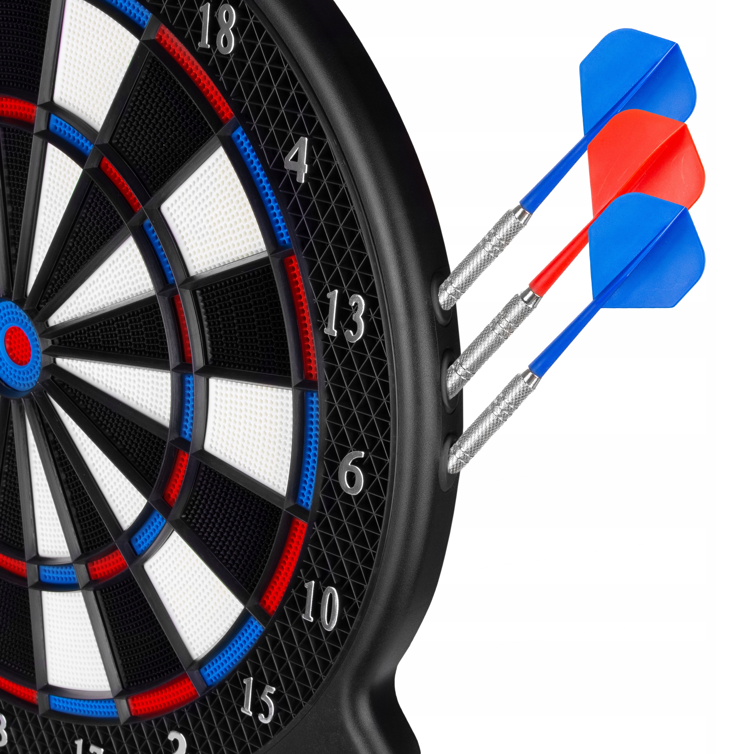 ✔️Спеціально розроблена структура з дуже чутливою матрицею гарантує 100% точність визначення точних кидків. Точно профільовані отвори, які ідеально підходять до м'яких наконечників, завдяки чому дротики завжди залишаються в мішені і не падають на підлогу, через що вони швидше зношуються.