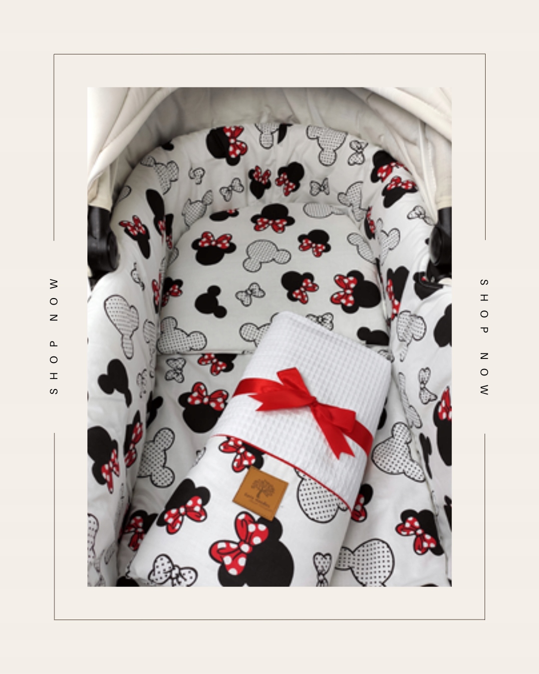 - Універсальний вкладиш підходить для більшості дитячих колясок. Ви можете затягнути все, як забажаєте, за допомогою вшитих ременів, які створюють декоративні дуги з обох боків коляски.
