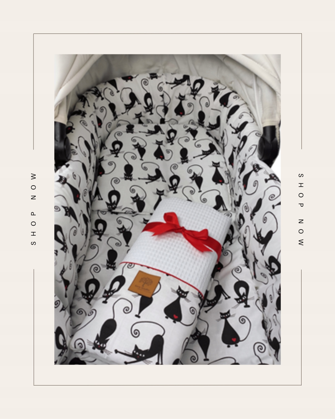 - Універсальний вкладиш підходить для більшості дитячих колясок. Ви можете затягнути все, як забажаєте, за допомогою вшитих ременів, які створюють декоративні дуги з обох боків коляски.