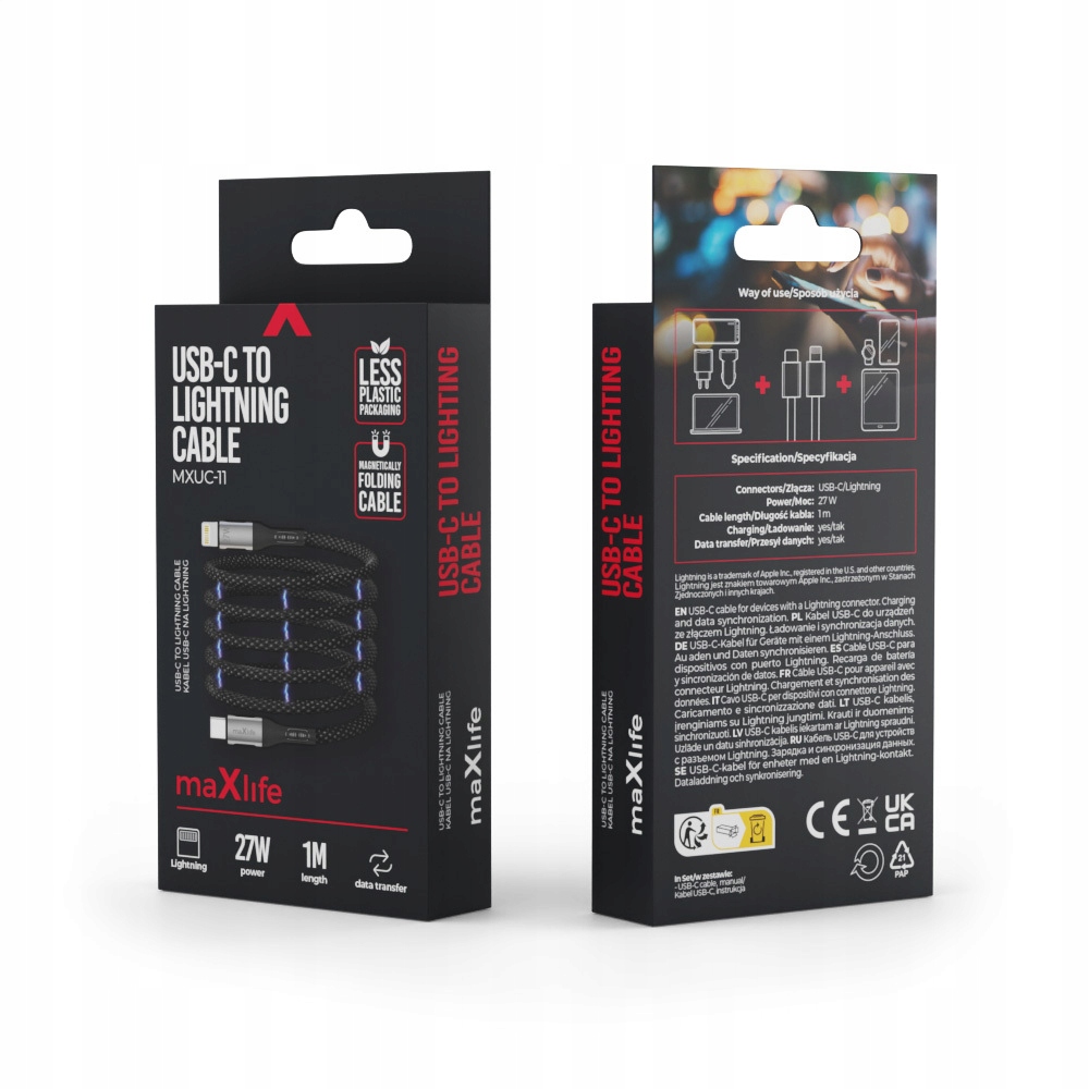 MaxLife MXUC-11 USB-C Магнітний кабель, що освітлює 1,0 м 27 Вт Чорний нейлоно