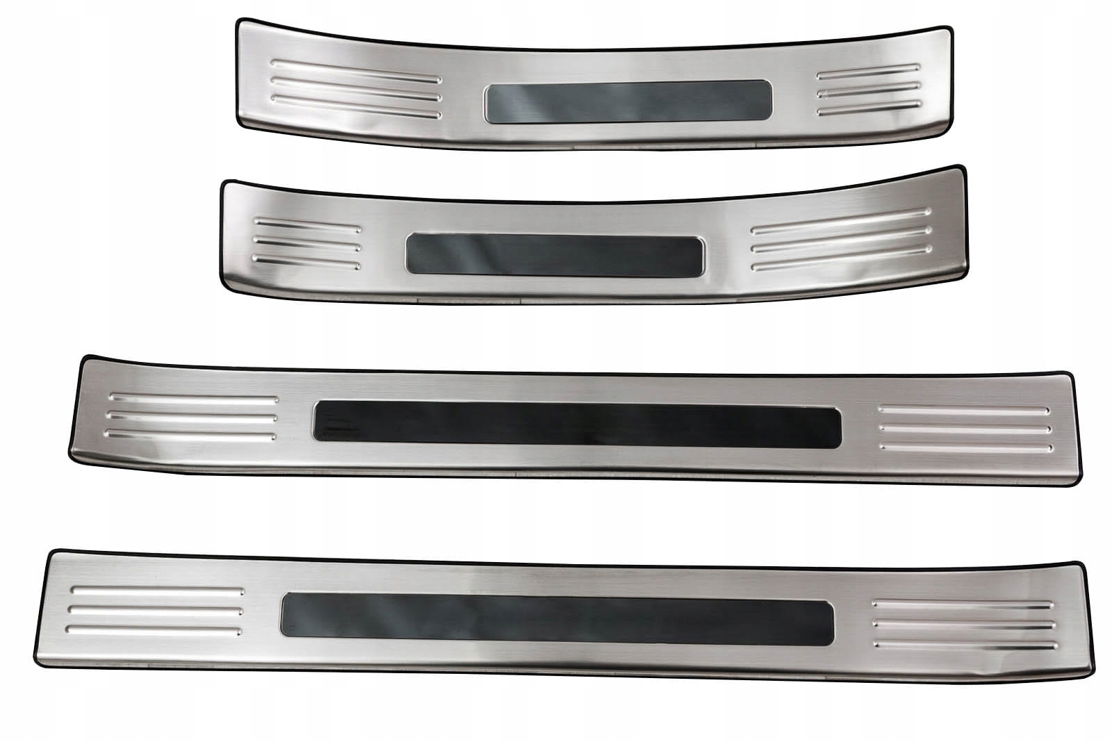 Смуги встановлені на лакованих частинах внутрішніх порогів. Вони доповнюють внутрішню лінію дверей, надають області порогів спорт та елегантний вигляд. Ця модель привертає увагу зі смаком поєднання ефектів сталевої обробки: відшліфовані фрагменти додають стильний блиск, а матові, матові деталі - це елегантний фон для написів, що їх прикрашають. Окрім цінностей укладання, планки відіграють захисну роль, захищаючи пороги від подряпин та пошкодження, які можуть виникнути при виїзді та виїзді з машини.