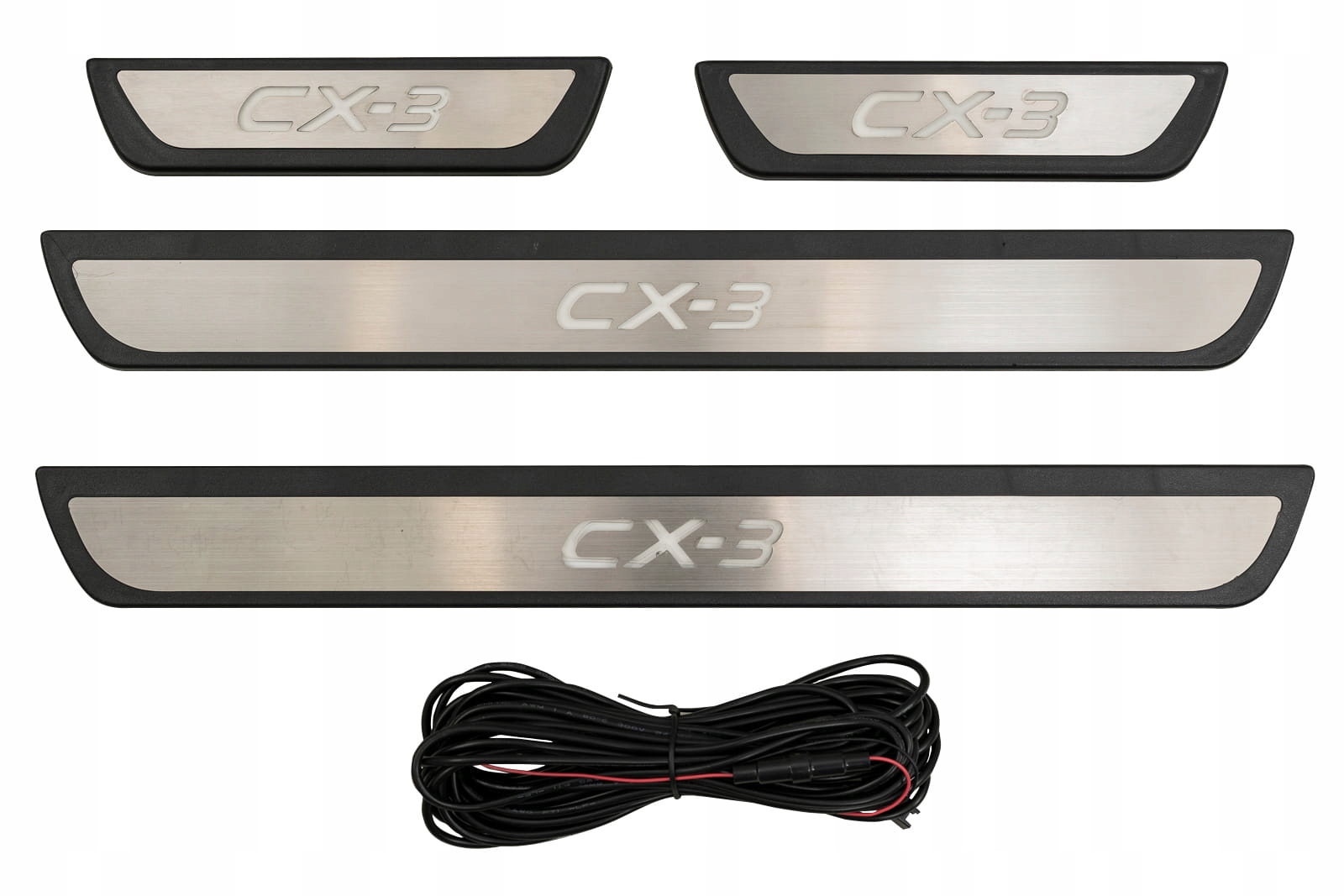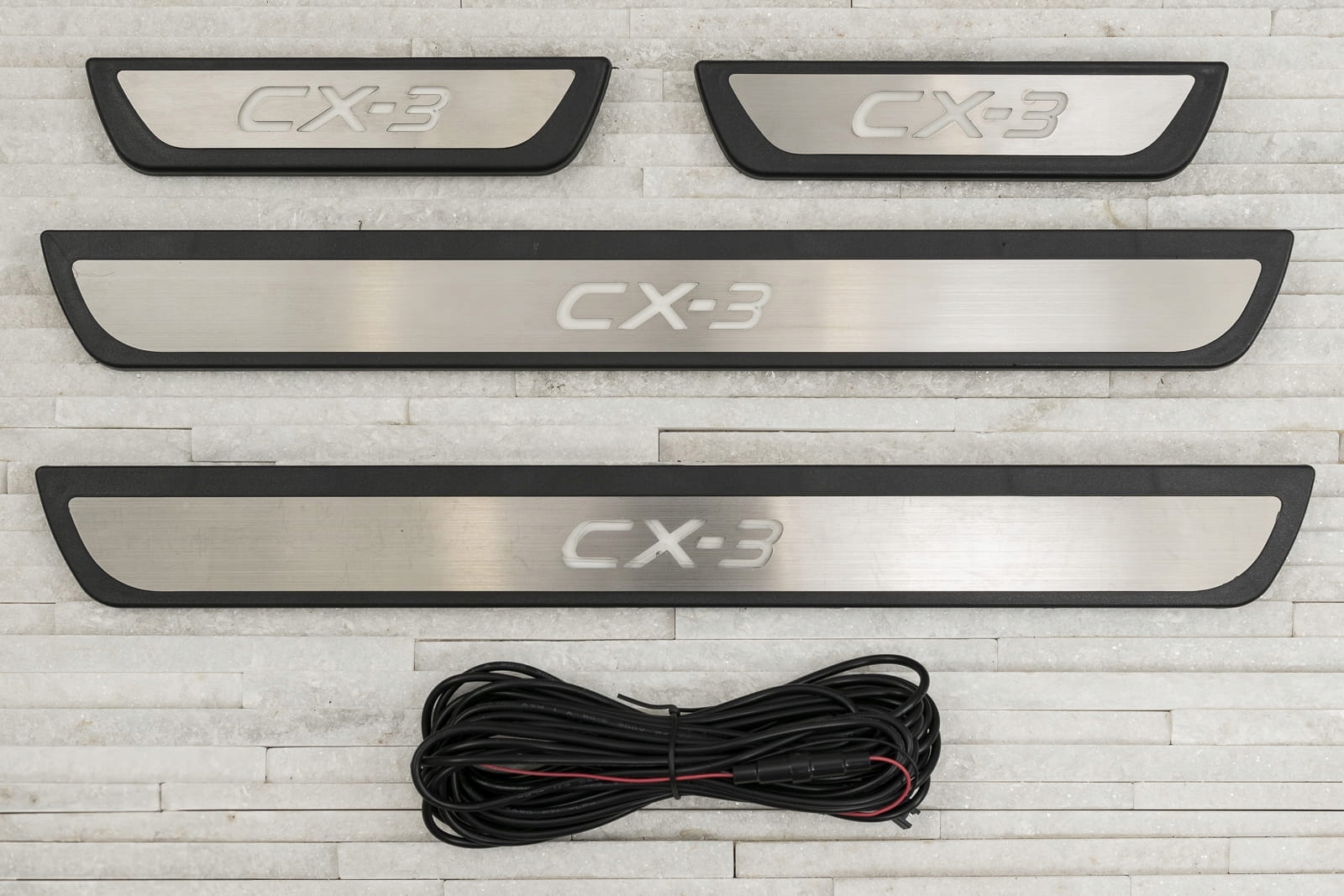 Планки кріпляться на пофарбовані частини внутрішніх порогів. Вони доповнюють внутрішню лінію дверей і надають поріжку спортивно-елегантний вигляд. Дана модель привертає увагу декоративним, підсвіченим написом CX-3. Завдяки вбудованому світлодіодному освітленню елемент не тільки підкреслює сучасний стиль автомобіля, але й підсвічує зону порогів, полегшуючи посадку та вихід.
