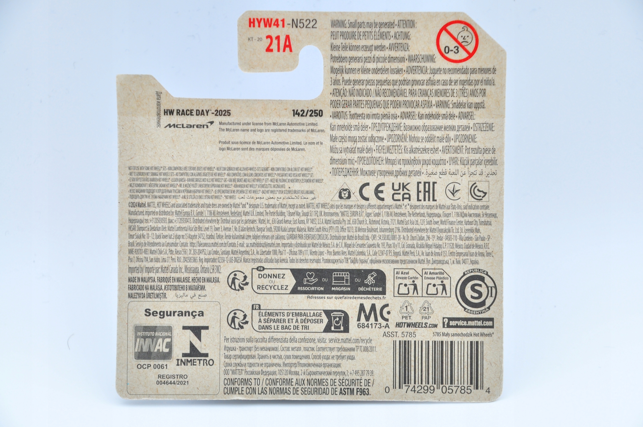 Код каталогу: HYW41-N522 - Рік публікації: 2025 - Серія колекціонера: День гонки HW - Рідкість: Шукаю - Цікаві факти: модель, натхненна справжнім Маклареном, цінується для унікальної картини.
