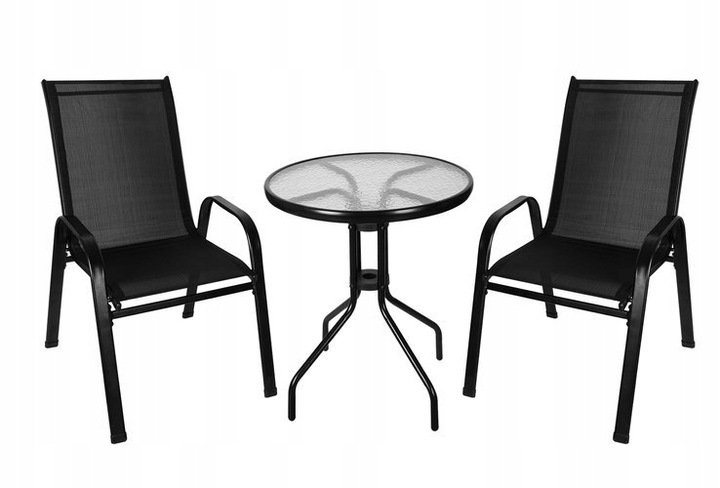 - меблі стійкі до погодних умов і легко миються. Сучасний і елегантний дизайн металевого комплекту з трьох предметів чудово підійде на балконі, терасі та в саду. У набір входять два зручних крісла/крісла зі спинками та стіл зі скляною стільницею.
