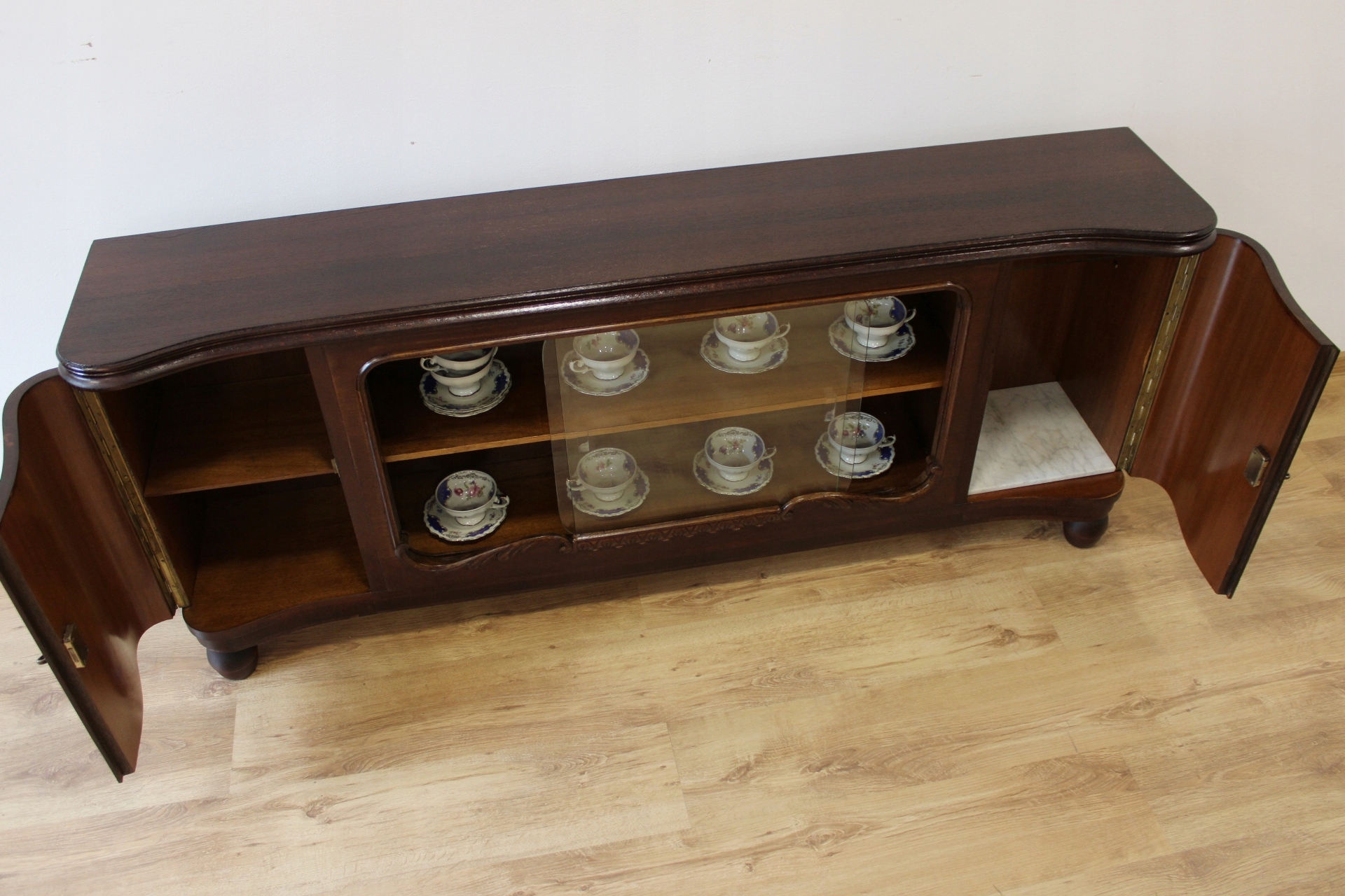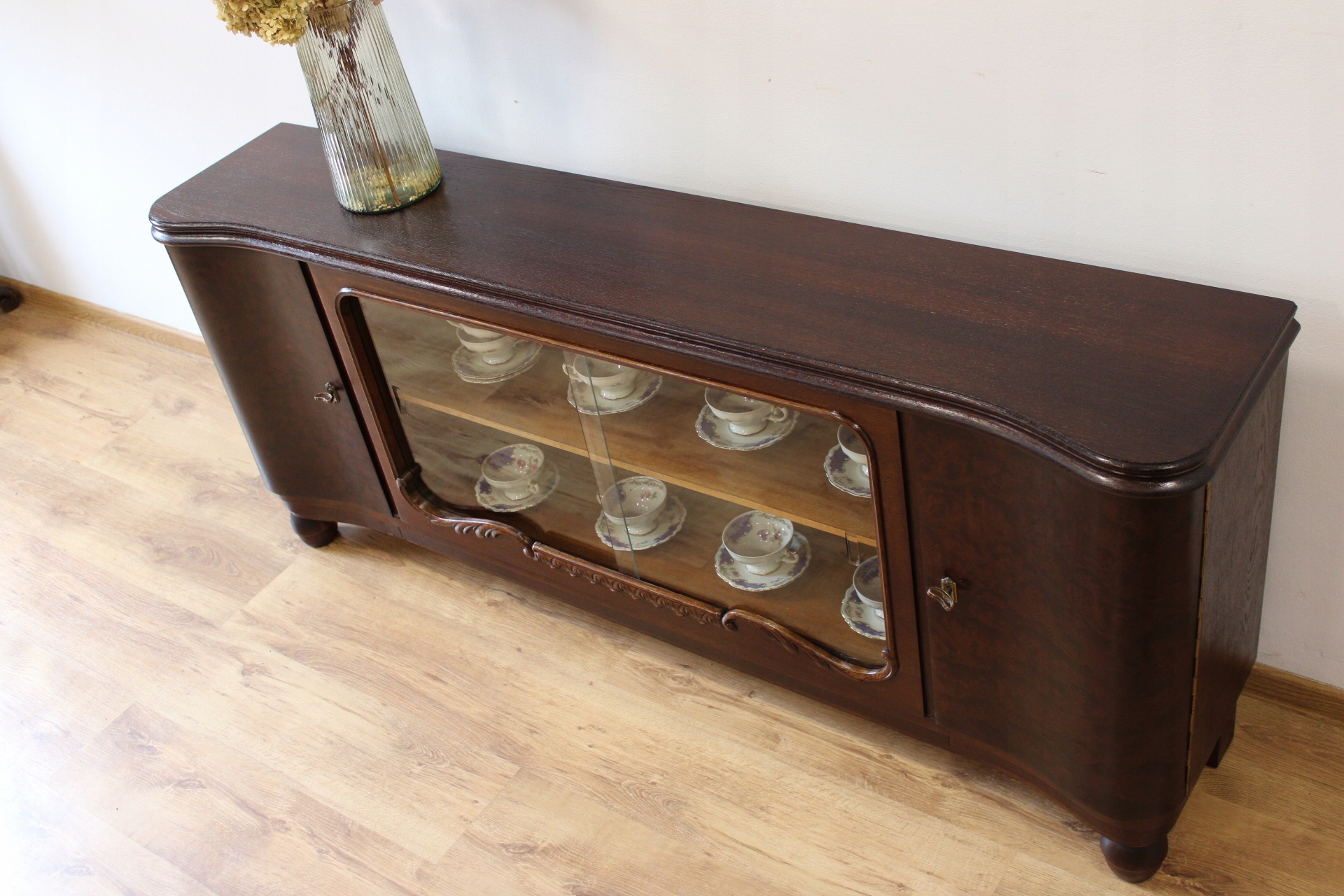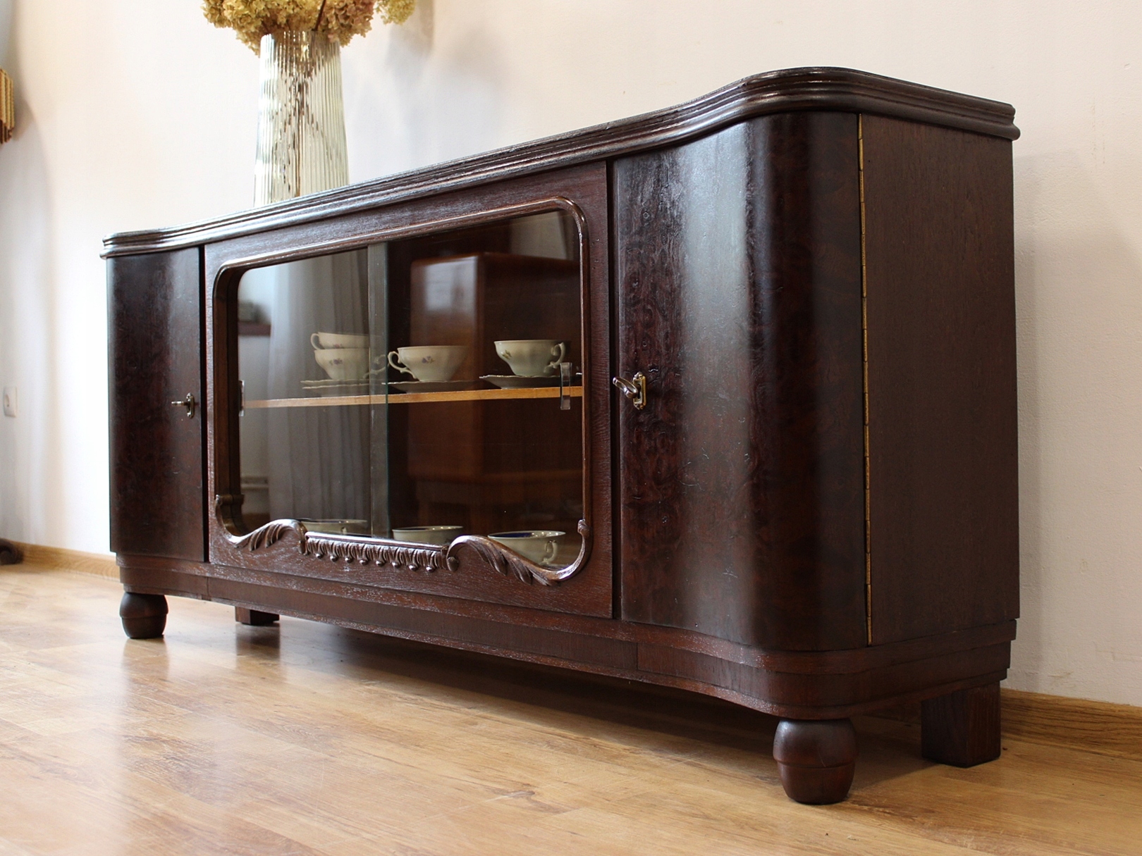 Низька шафа, вітрина з розсувним склом і вигнутими дверцятами.