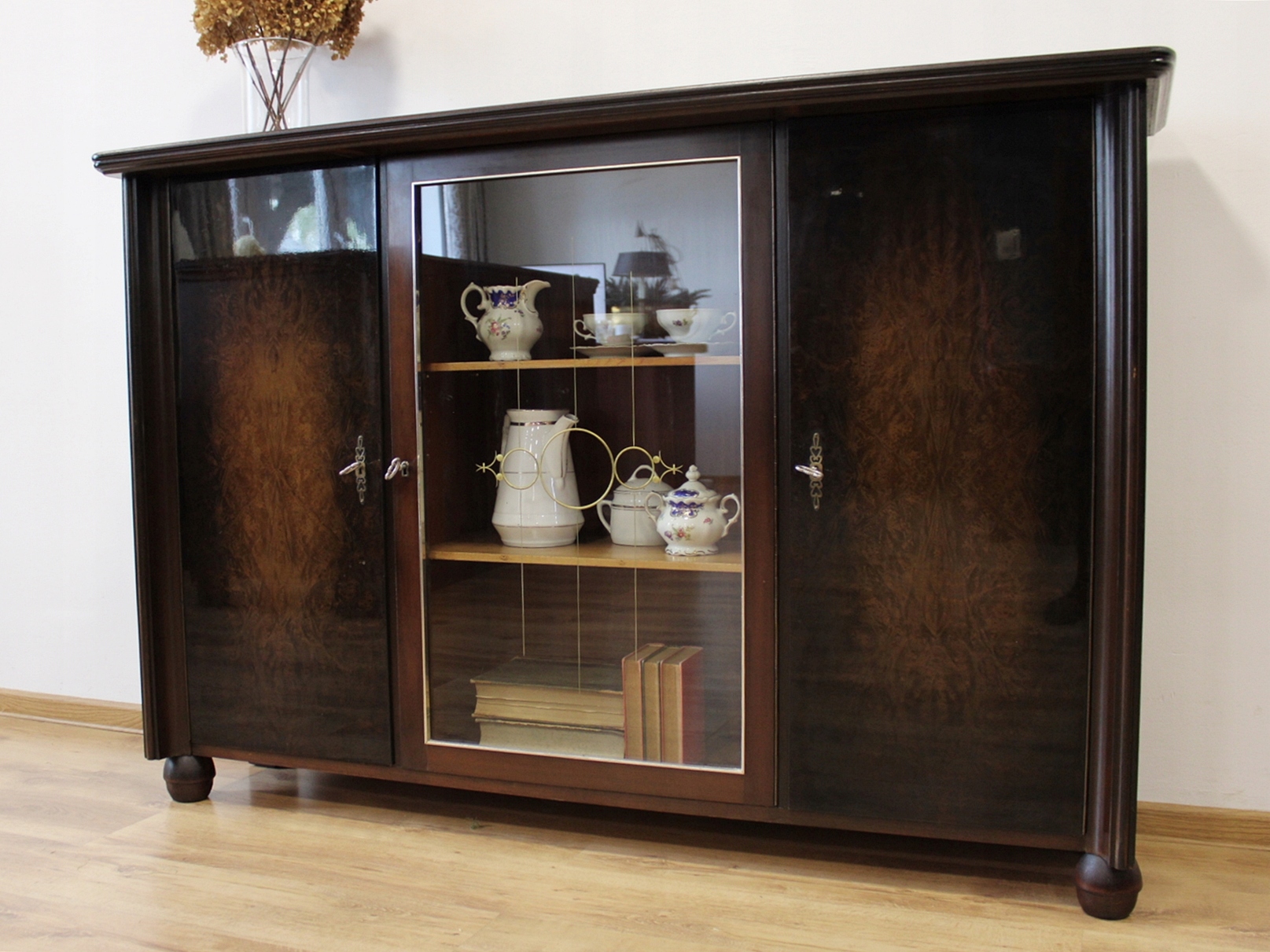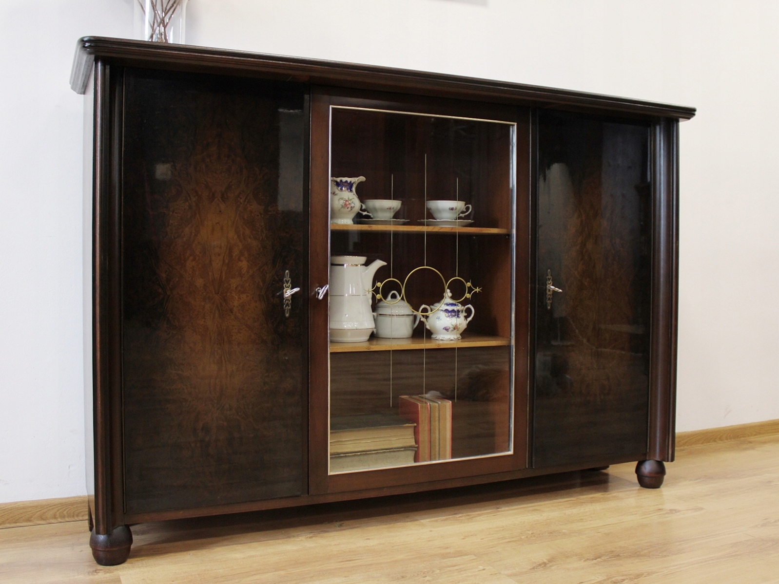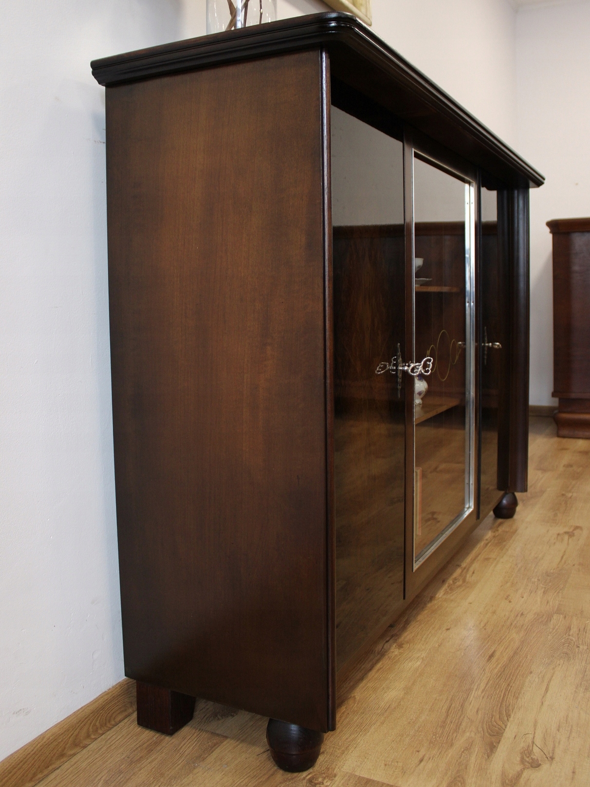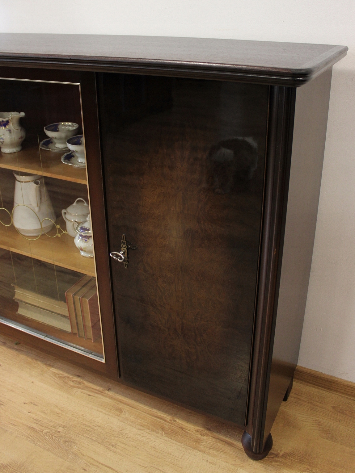 Стан дуже хороший. Меблі готові до використання. Оновлено зовнішні поверхні та інтер’єр меблів. Меблі вже старі, а сліди минулого, які не впливають на їх естетичне сприйняття, є доказом автентичності меблів. Вітрину можна відразу поставити в квартиру.
