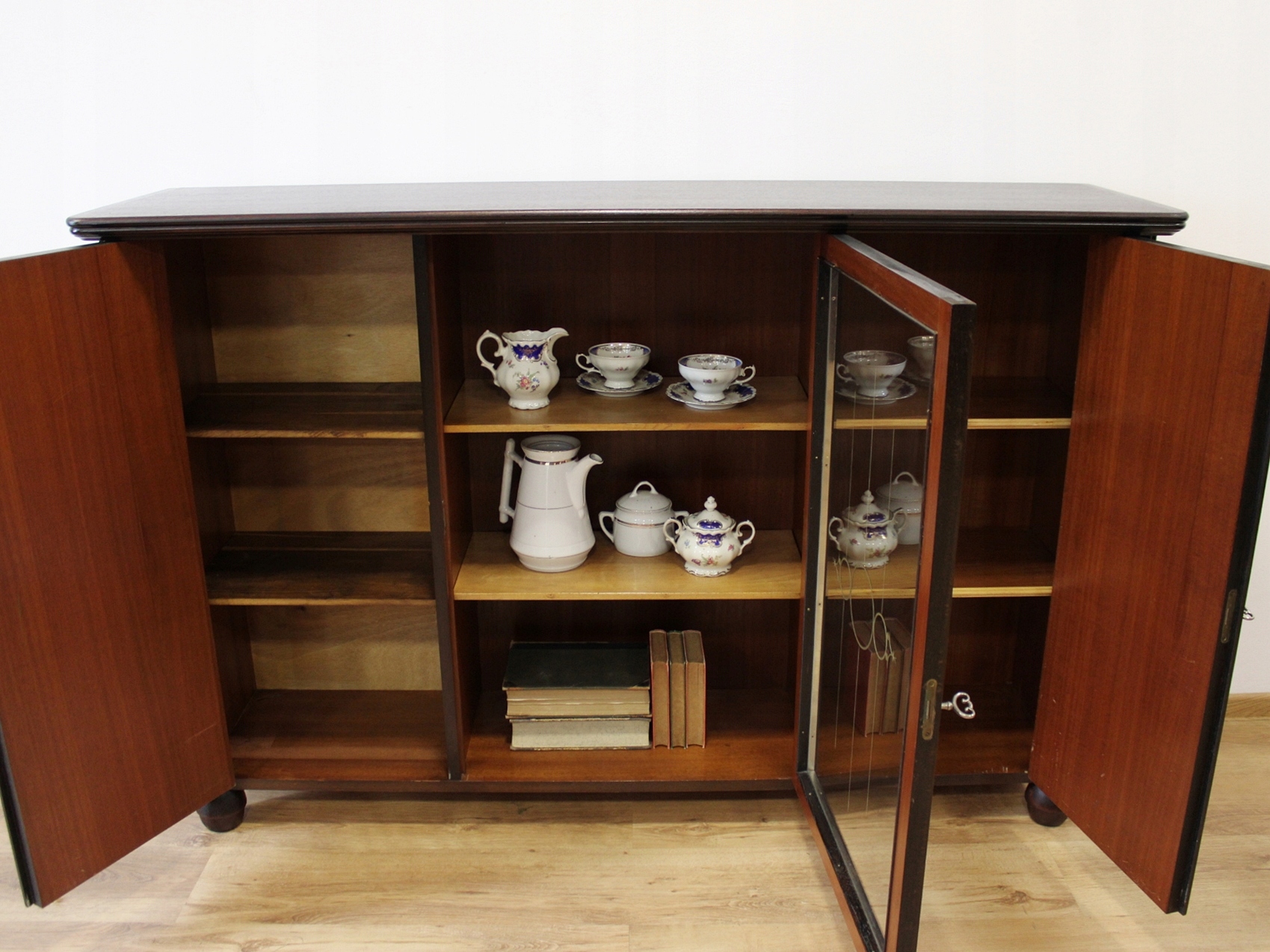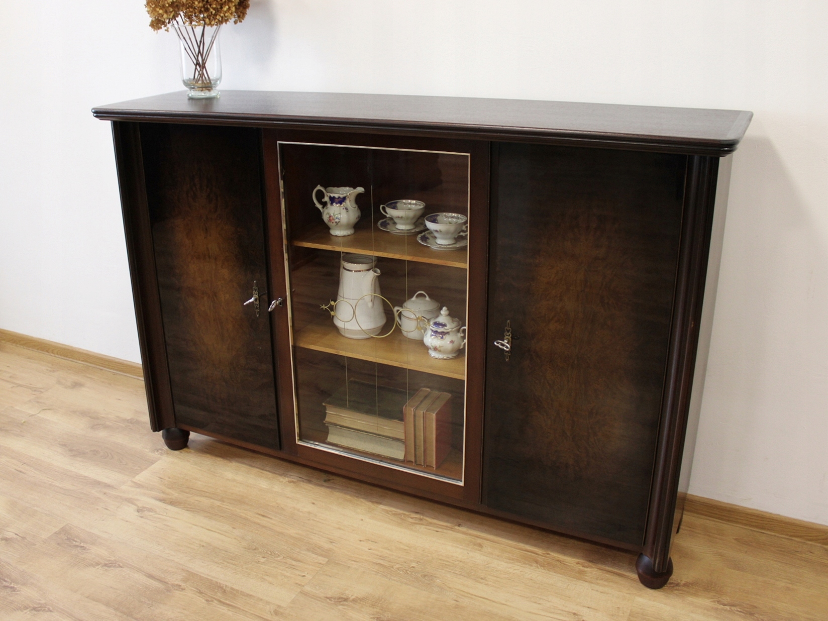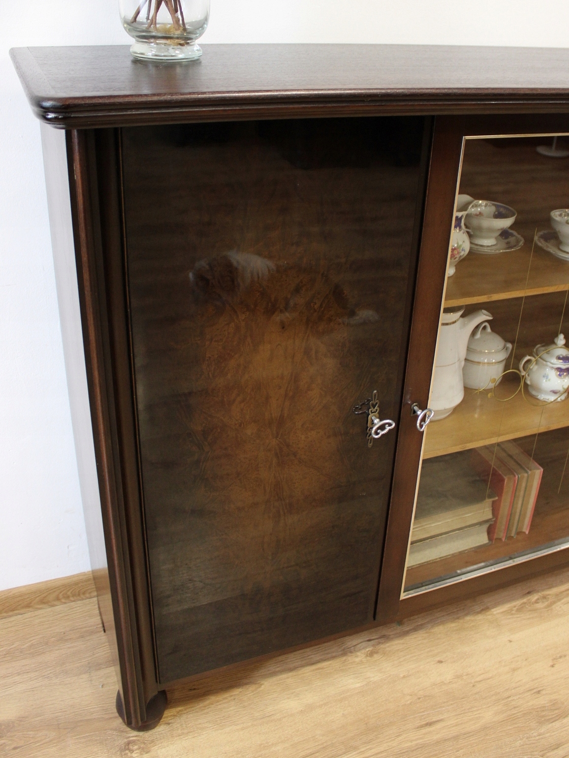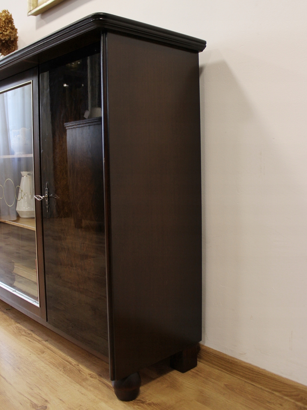 Стан дуже хороший. Меблі готові до використання. Оновлено зовнішні поверхні та інтер’єр меблів. Меблі вже старі, а сліди минулого, які не впливають на їх естетичне сприйняття, є доказом автентичності меблів. Вітрину можна відразу поставити в квартиру.
