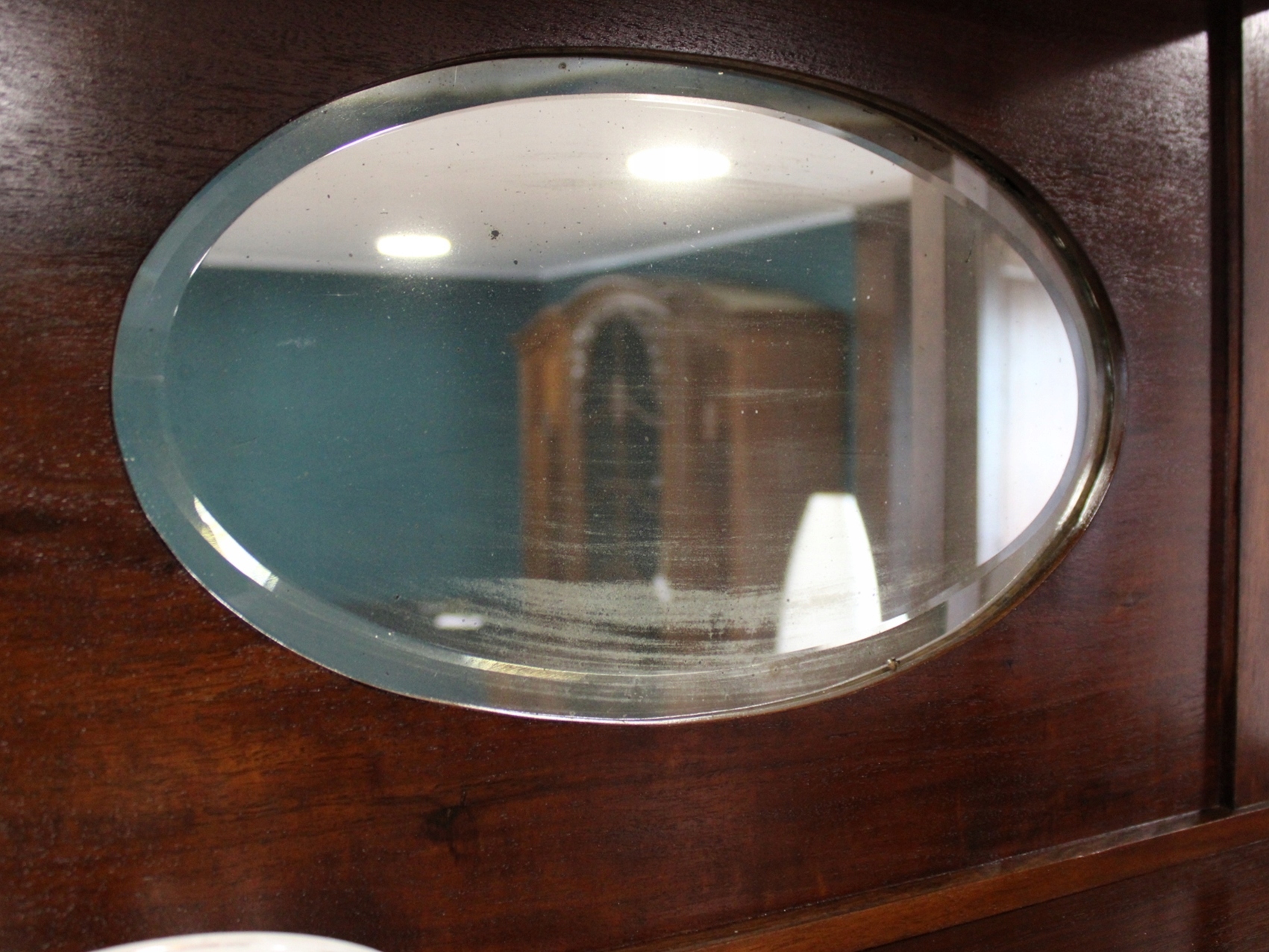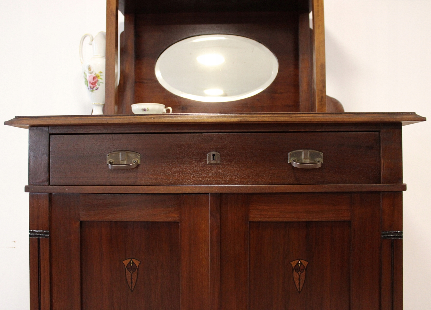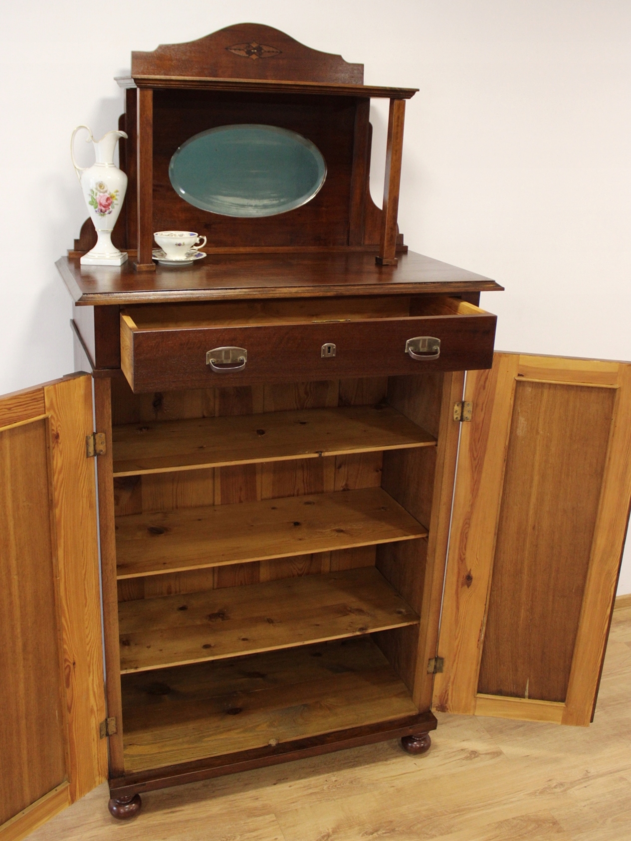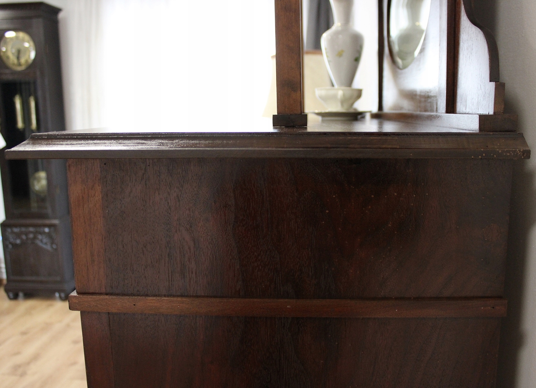Гарна шафа для білизни з горіхового дерева з інкрустацією, оригінальною фурнітурою та оригінальним овальним дзеркалом. Простий за формою, він поміщається в багатьох місцях і може вмістити велику кількість взуття, постільної білизни чи інших предметів.