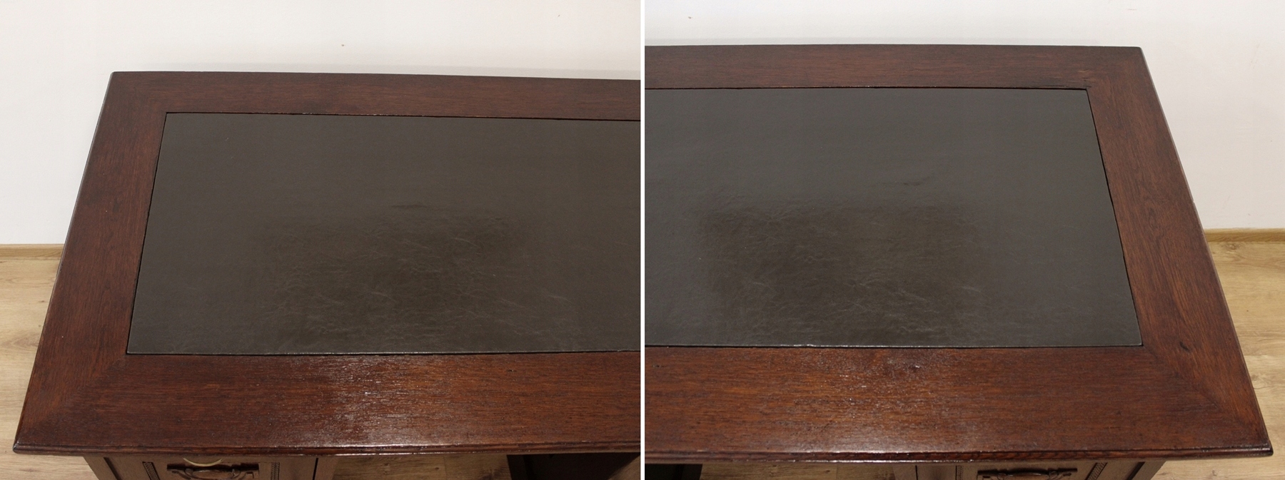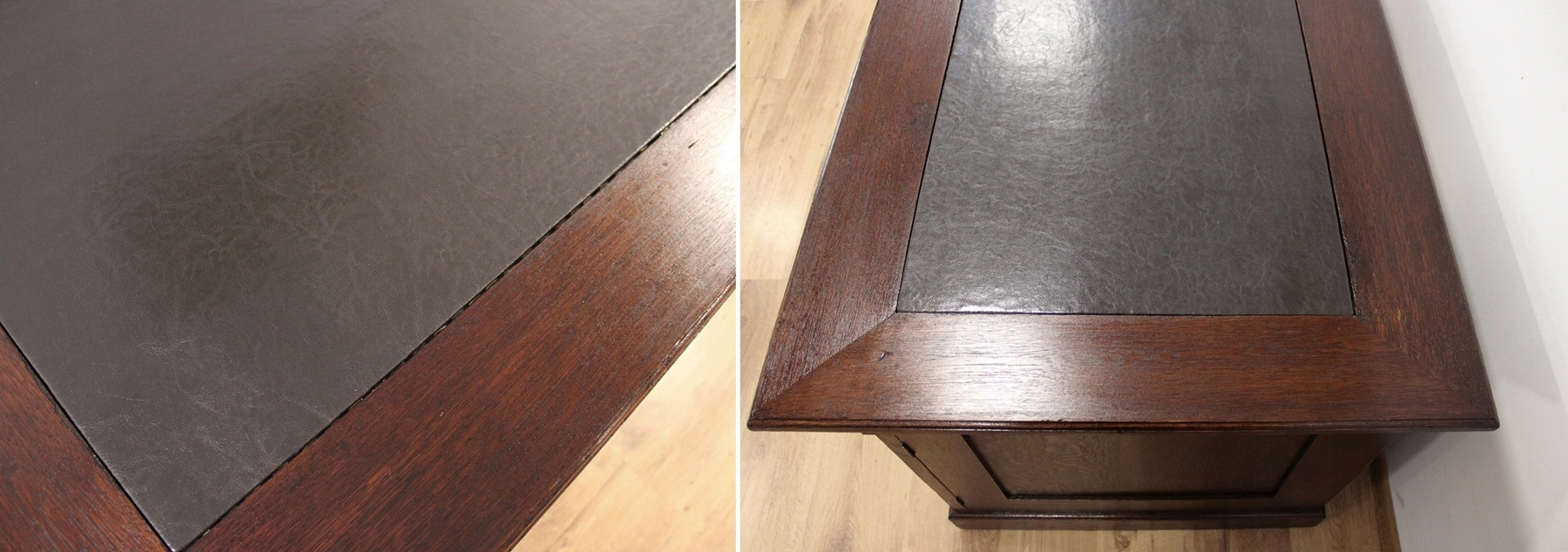 Стільниця обшита шкірозамінником з ніжними хвилями, не ідеально поєднується з рамою.