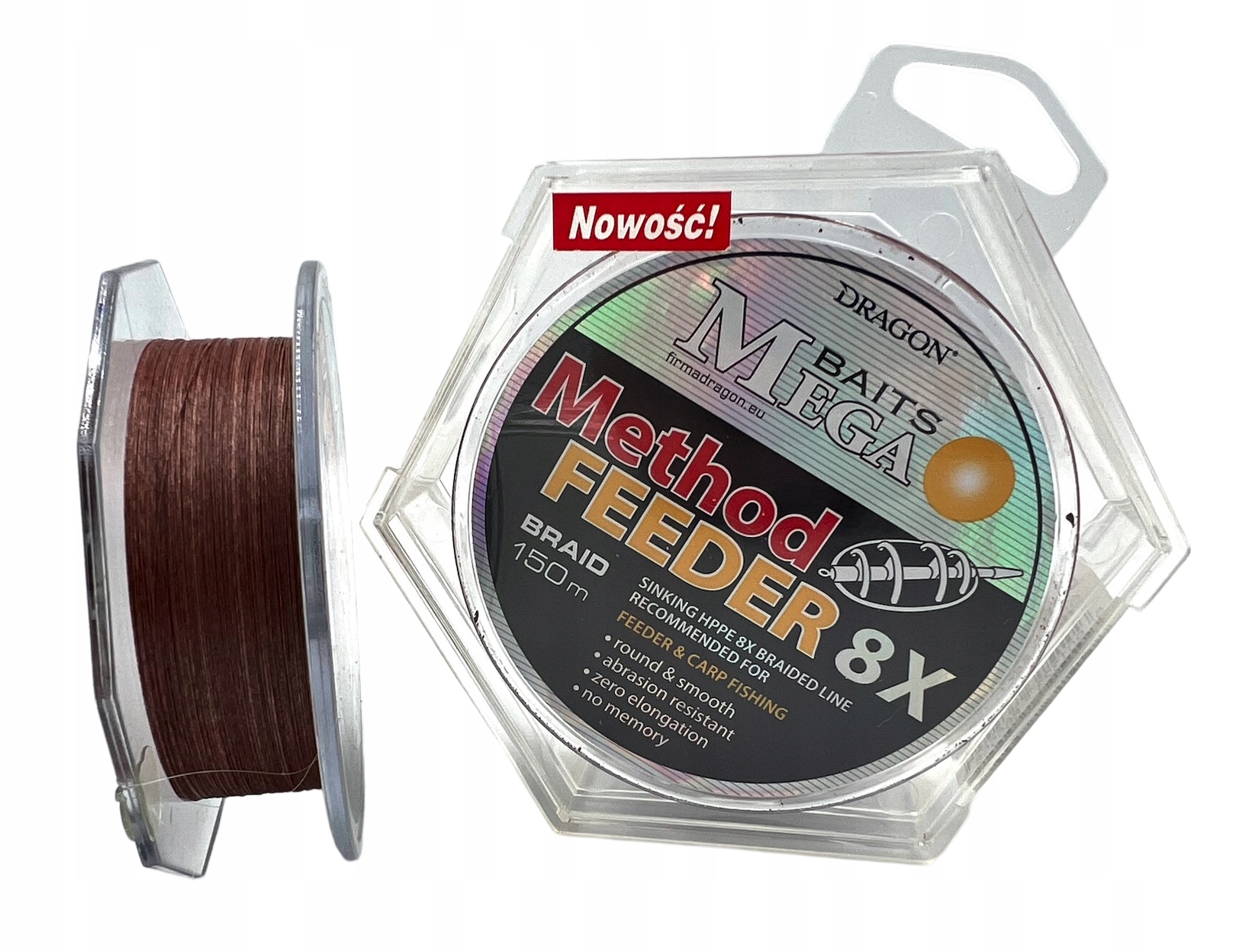 Method Feeder 8X — це перша ґрунтова, тонуча плетена волосінь MegaBAITS, виготовлена за технологією восьми ниток. Призначений передусім для т. зв методів, але, звичайно, він буде працювати у всіх грунтових техніках з різними типами кошиків для наживки, при використанні таких вудилищ, як вібраційний наконечник (сагайдак, фідер). Найважливіші технічні параметри плетінки MegaBAITS Method Feeder 8X: виготовлена з поліетиленових волокон високої якості HPPE за технологією восьми ниток; легке занурення завдяки питомій вазі, більшій за воду; поверхня з винятковою гладкістю; ідеально круглий перетин; зведена до нуля розтяжність; дуже висока стійкість до стирання; виняткова лінійна і вузлова міцність по відношенню до фактичного діаметру; колір: коричневий; пропонується на 150-метрових котушках.