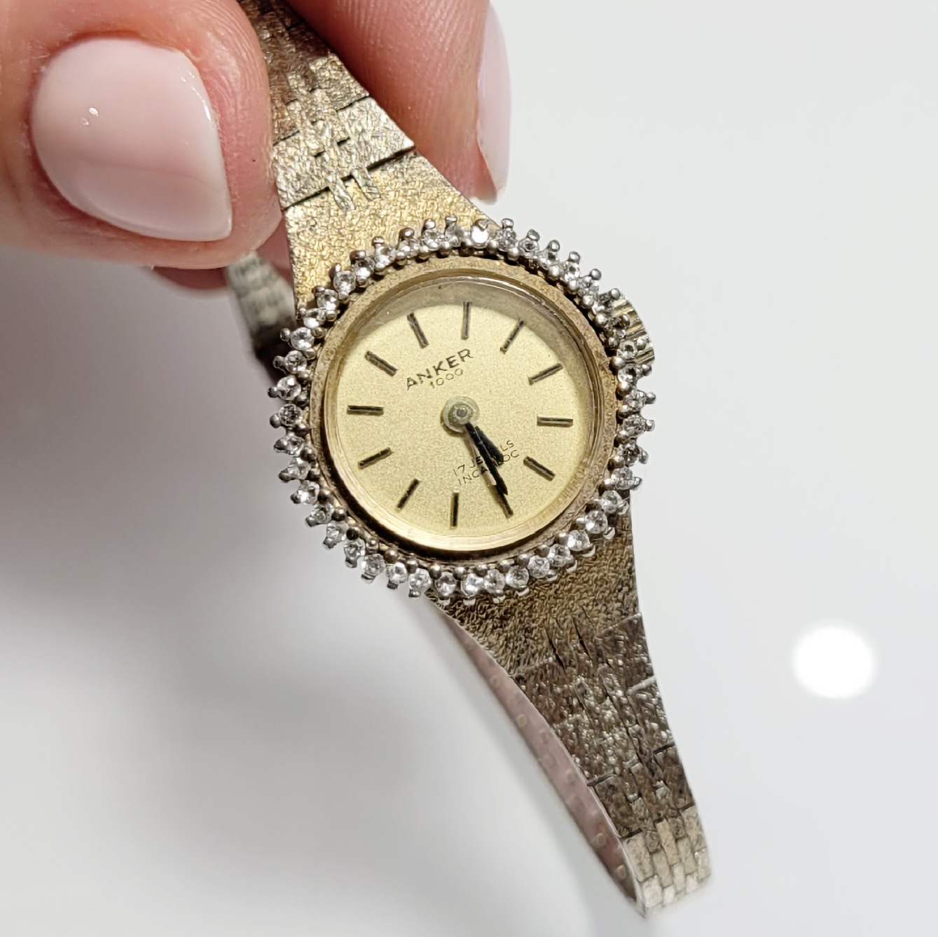 Тема продажу - різноманітні жіночі годинники - Анкер, виготовлений з позолоченого срібла, з щитом, оточеним натуральними каменями; Механічні, ефективні