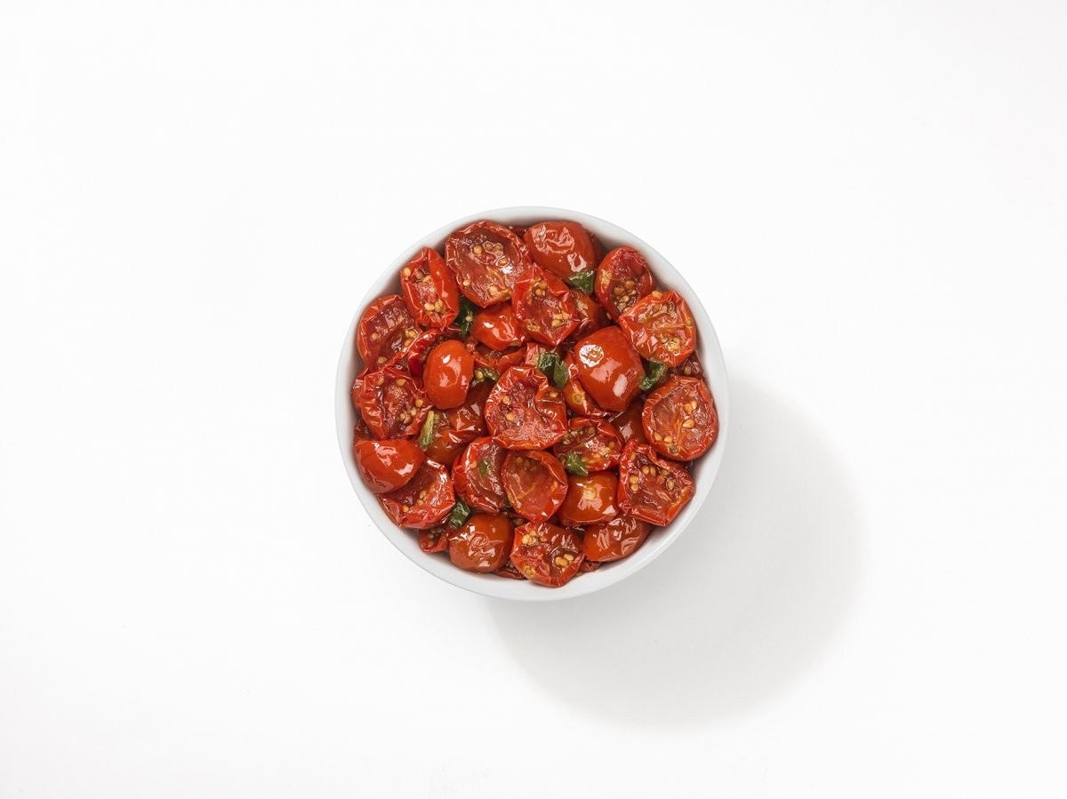 коктейльні помідори з базиліком в оливковій олії - помідори, обережно висушені на сонці, з солодким і інтенсивним смаком, надзвичайно м'якими та свіжими, приправленими оливковою олією та базиліком, не містять оцту. Ідеально підходить для піци, заправок, бутербродів, тостів і як закуски.