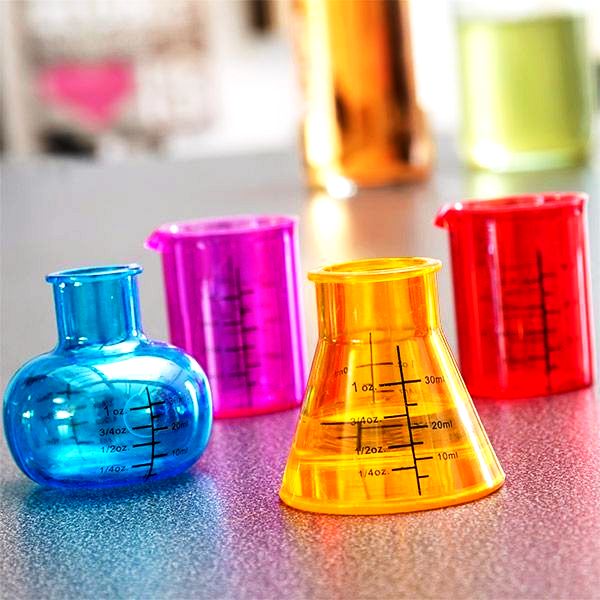 - чарки у формі різнокольорових хімічних склянок