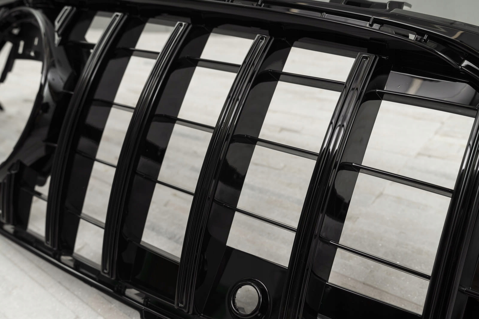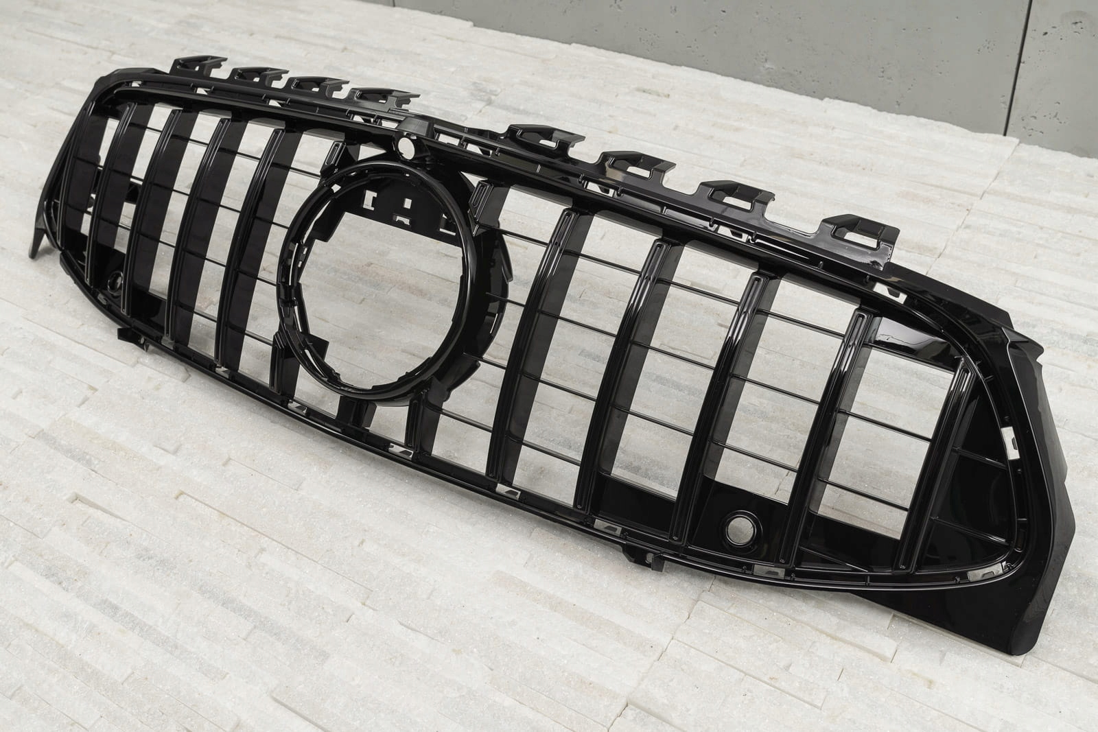 Передня решітка, модель GT / PANAMERICANA для MERCEDES CLA (C118) 2019+ (ВЕРСІЯ З ЗАВОДСЬКОЮ КАМЕРОЮ). Спеціальна решітка виконана в стилі, типовому для автомобілів сегменту GT. Решітка радіатора прикрашена широкими чорними поперечинами, які неодмінно нагадують про респектабельні, потужні автомобілі топ-полиці. Елемент вражає своїм спортивним характером, ідеально поєднуючись із вражаючим дизайном Mercedes.